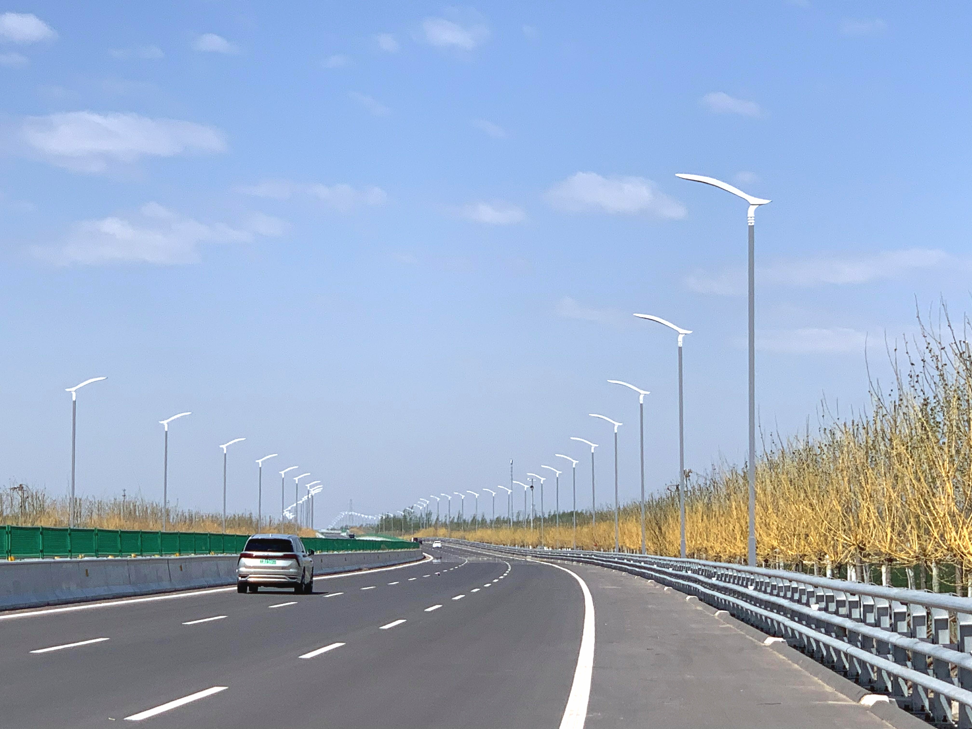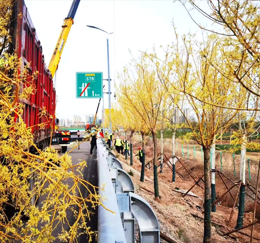 该项目共种植金叶国槐2711株,法桐2711株,连翘100464株,通过上层骨干乔木与中下层花灌木的科学配置,形成了“层次立体、季相分明”的景观风貌,有效改善了沿线生态环境,提升了行车舒适性。金枝国槐等特色植物在冬春时节尤为亮眼,成为道路两侧的独特生态标识。