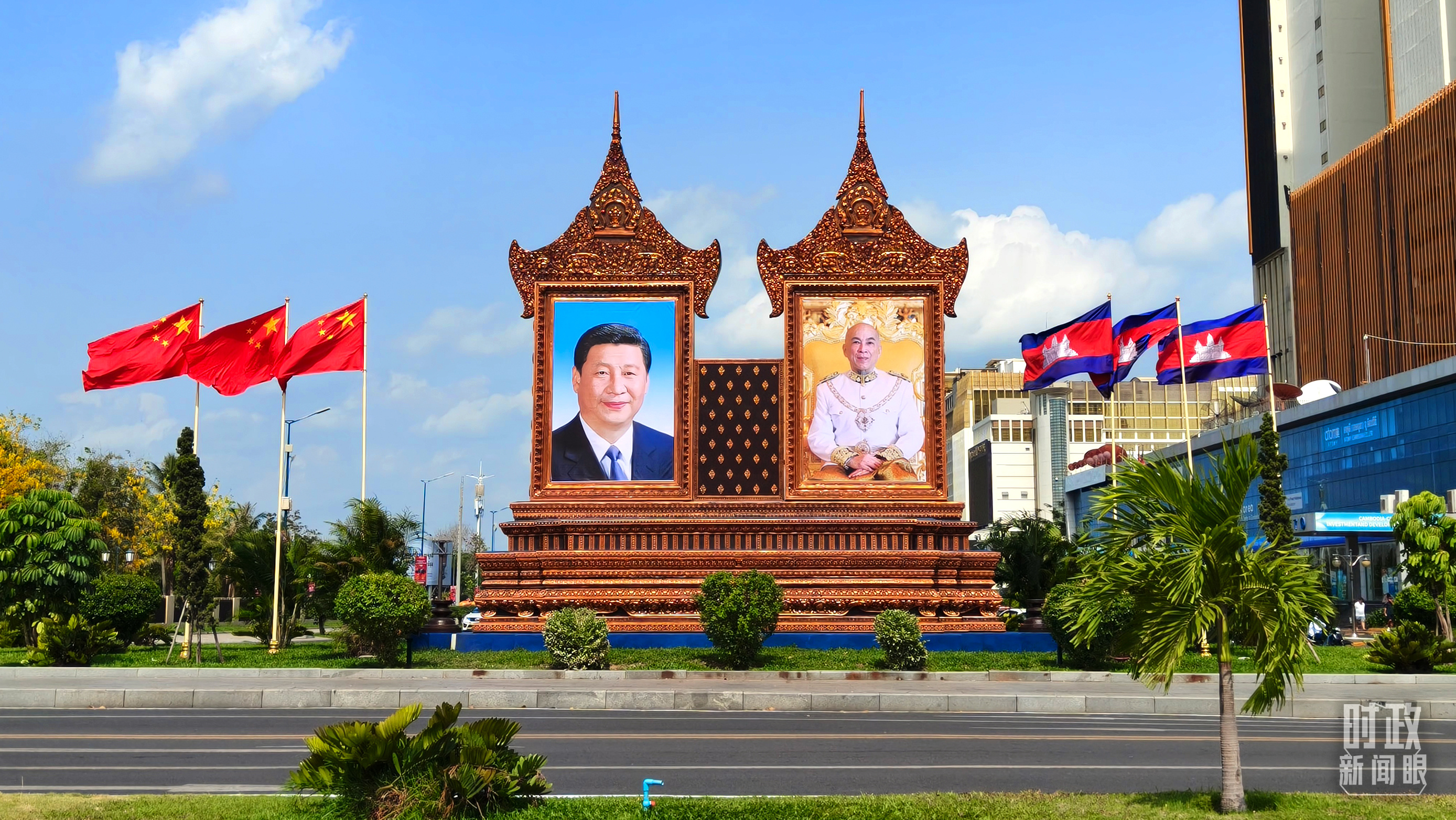 △金边街头的巨幅中柬两国领导人照片和国旗。(总台央视记者陆泓宇拍摄)