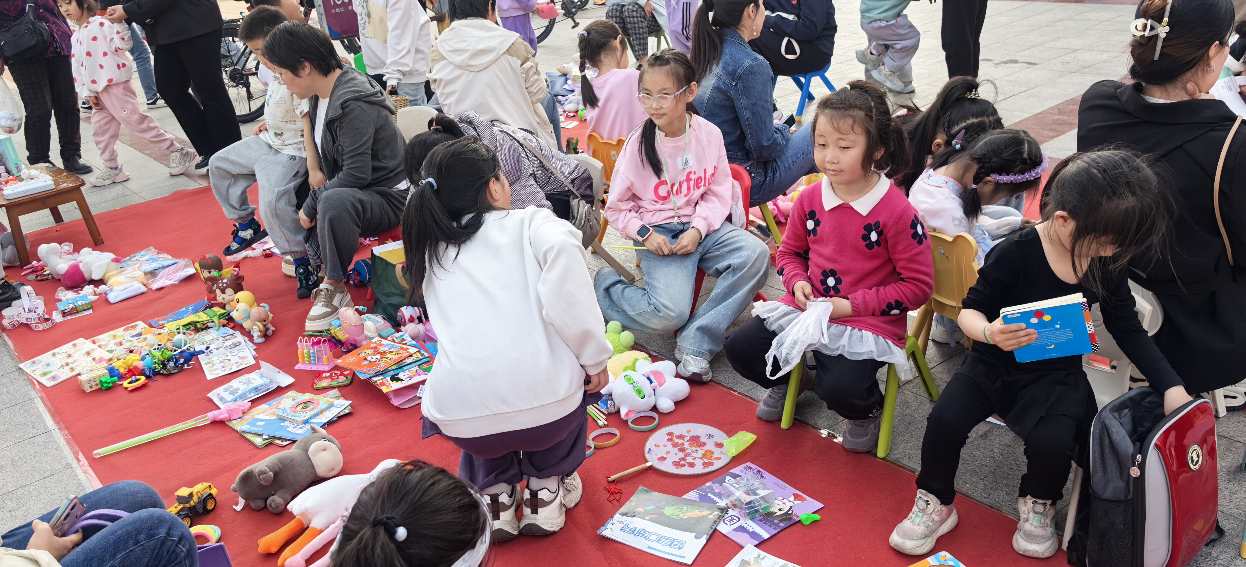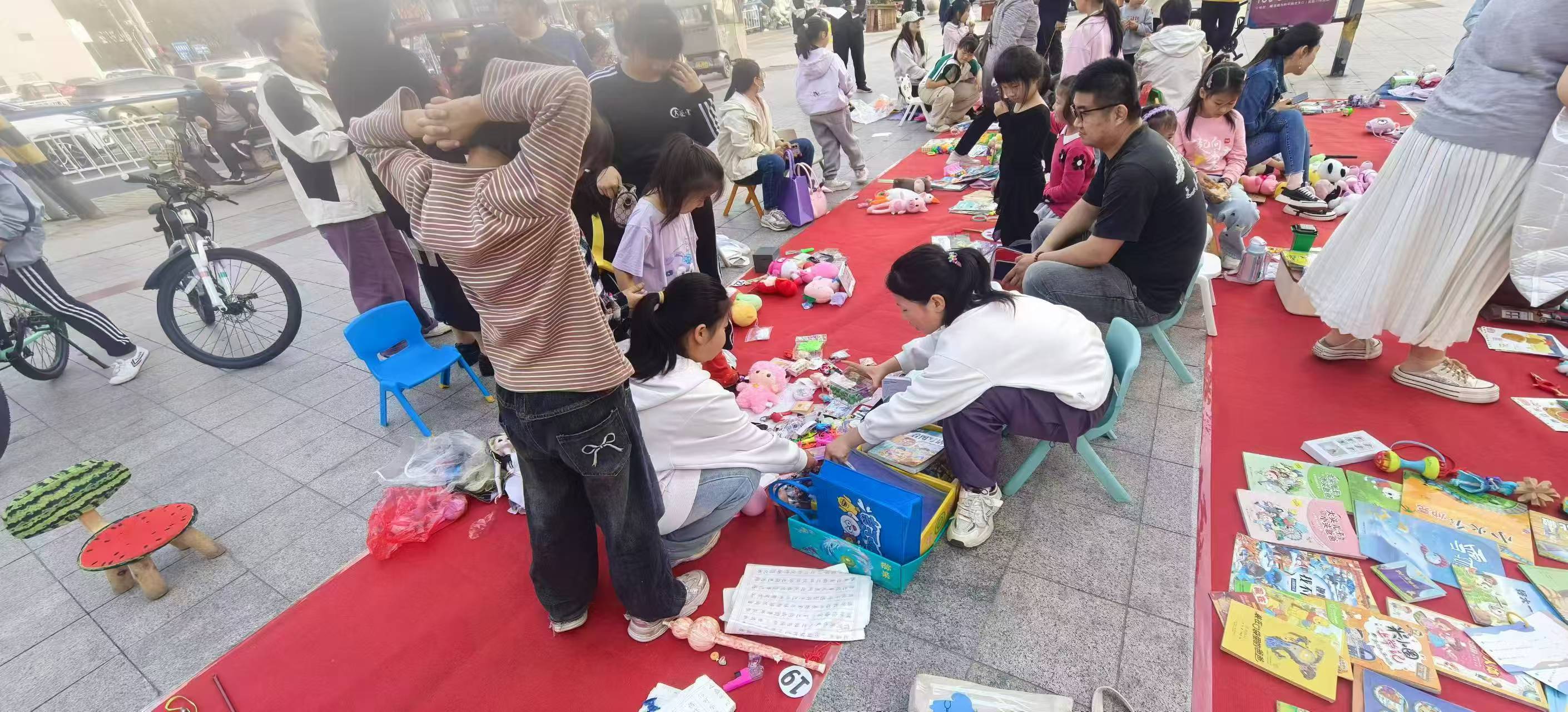 当天,家长们带着孩子早早来到现场布置摊位。摊位上摆满了各式各样的物品,有旧的书籍绘本、闲置的儿童玩具和文具用品、孩子们的手工作品等。物品除了可以交换之外,还可以买卖,定价多为一元、两元。孩子们在摊位前热情地介绍自己的商品,有的孩子还精心制作了宣传海报,推荐自己认为最有趣的商品,吸引顾客。家长们也积极参与其中,在一旁耐心地引导和协助孩子们。