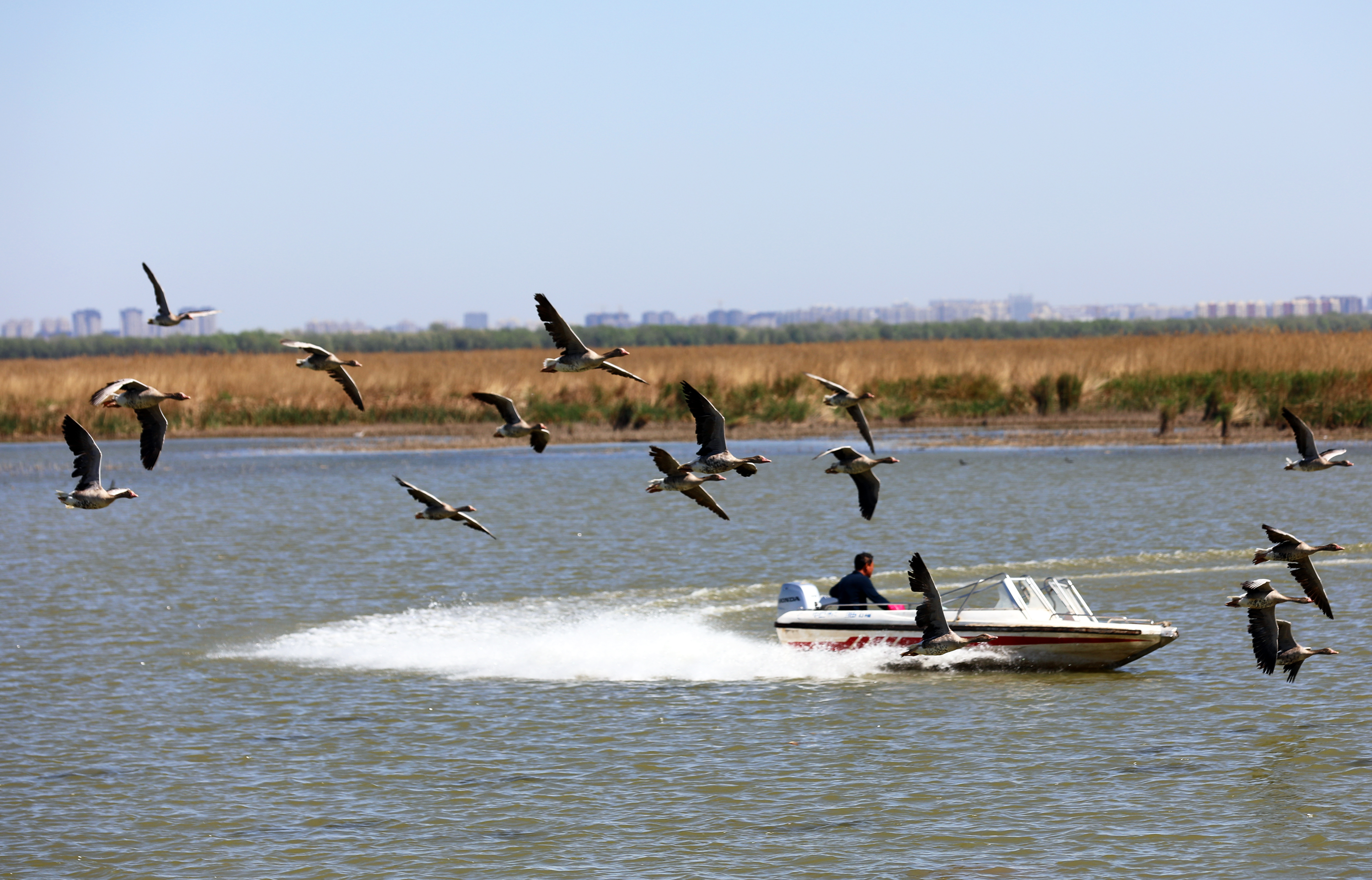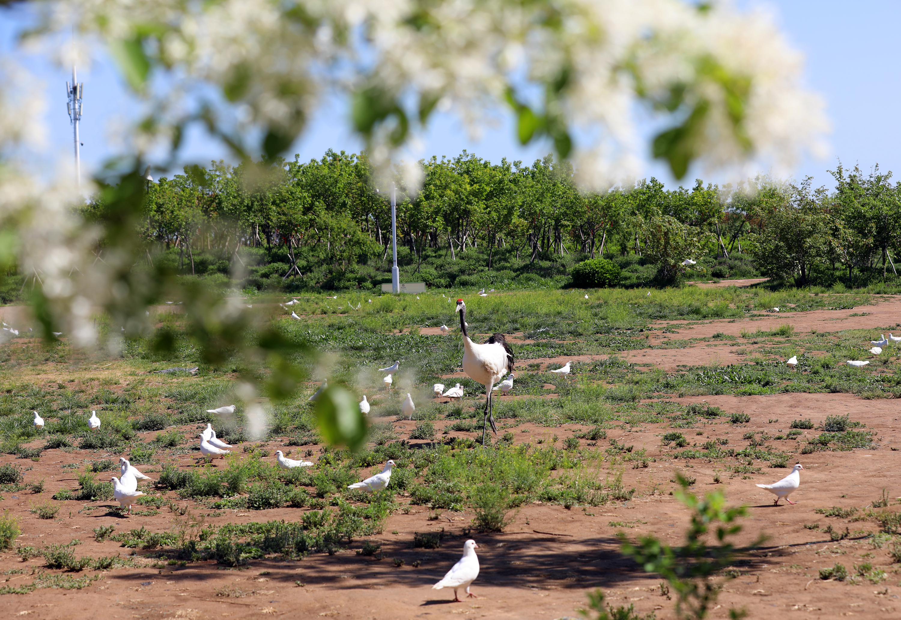 除了烂漫的流苏花,樱花岛上众多水鸟或在湖面嬉戏觅食,或于空中盘旋飞翔,欢快的鸟鸣声与游人的欢声笑语交织在一起,构成了一曲人与自然和谐共生的美妙乐章,生动地展现出衡水湖生机勃勃、温馨美好的生态画卷。
