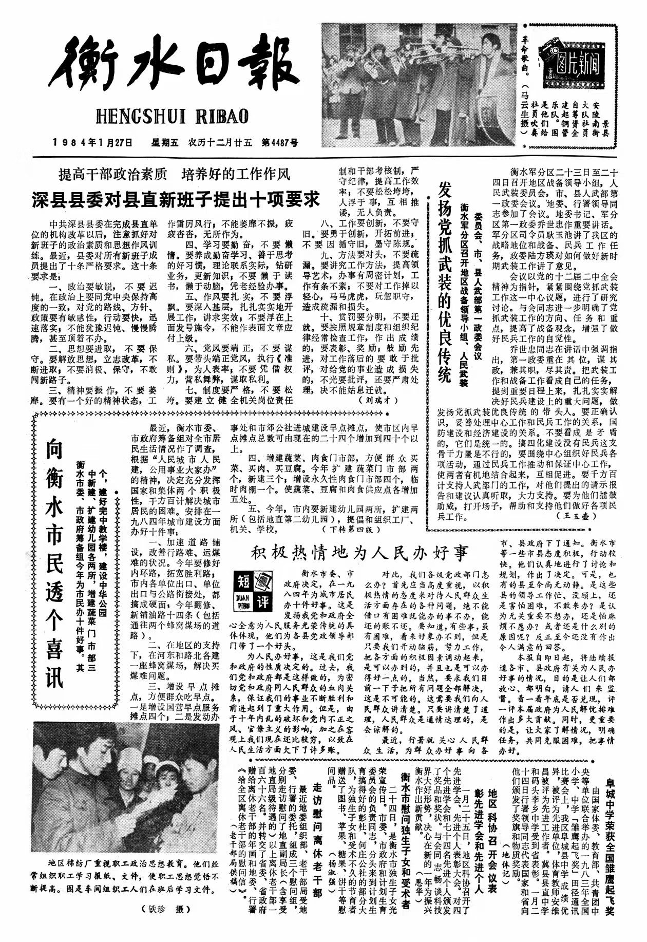 1984年,衡水市(现桃城区)委、市政府“安排在城市建设方面办好十件事”,其中之一是“今年国庆节前完成中华公园第一期工程,正式划定人民公园的园址”(1984年1月27日1版)。5月13日4版刊发“募捐号召”:这次将要营建的欲飞天鹅和登月火箭,是我市第一座公园——中华公园的两个主要建筑项目。前者是我市第一座城市建筑小品,后者为我市第一个大型儿童游艺器械。“需用款八万元……向衡水市和驻市单位的干部、职工及离休退休的同志发出每人捐款一元的号召。”