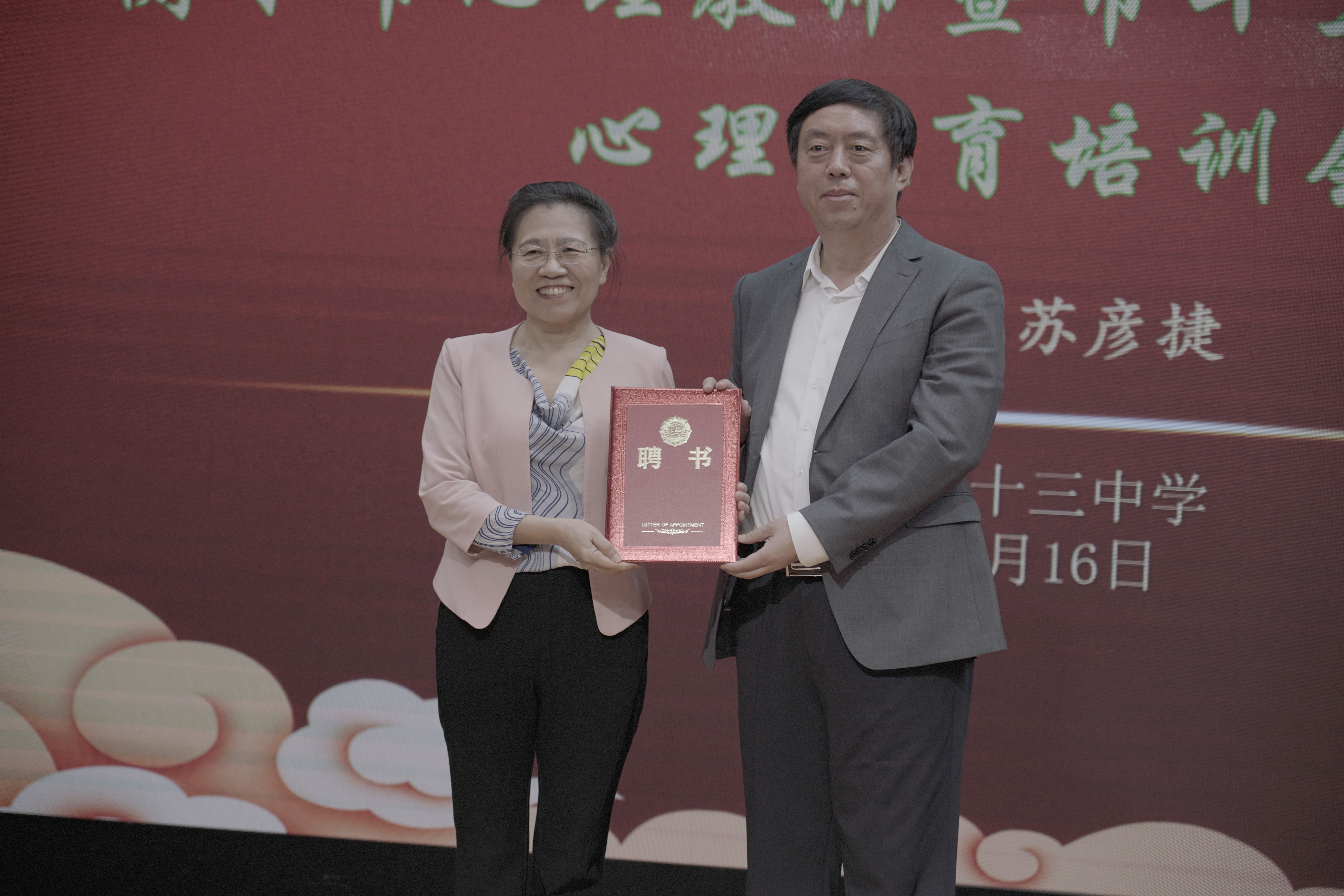 衡水市教育局督学、衡水十三中党委书记白祥友(右)为苏彦捷教授颁发聘书。