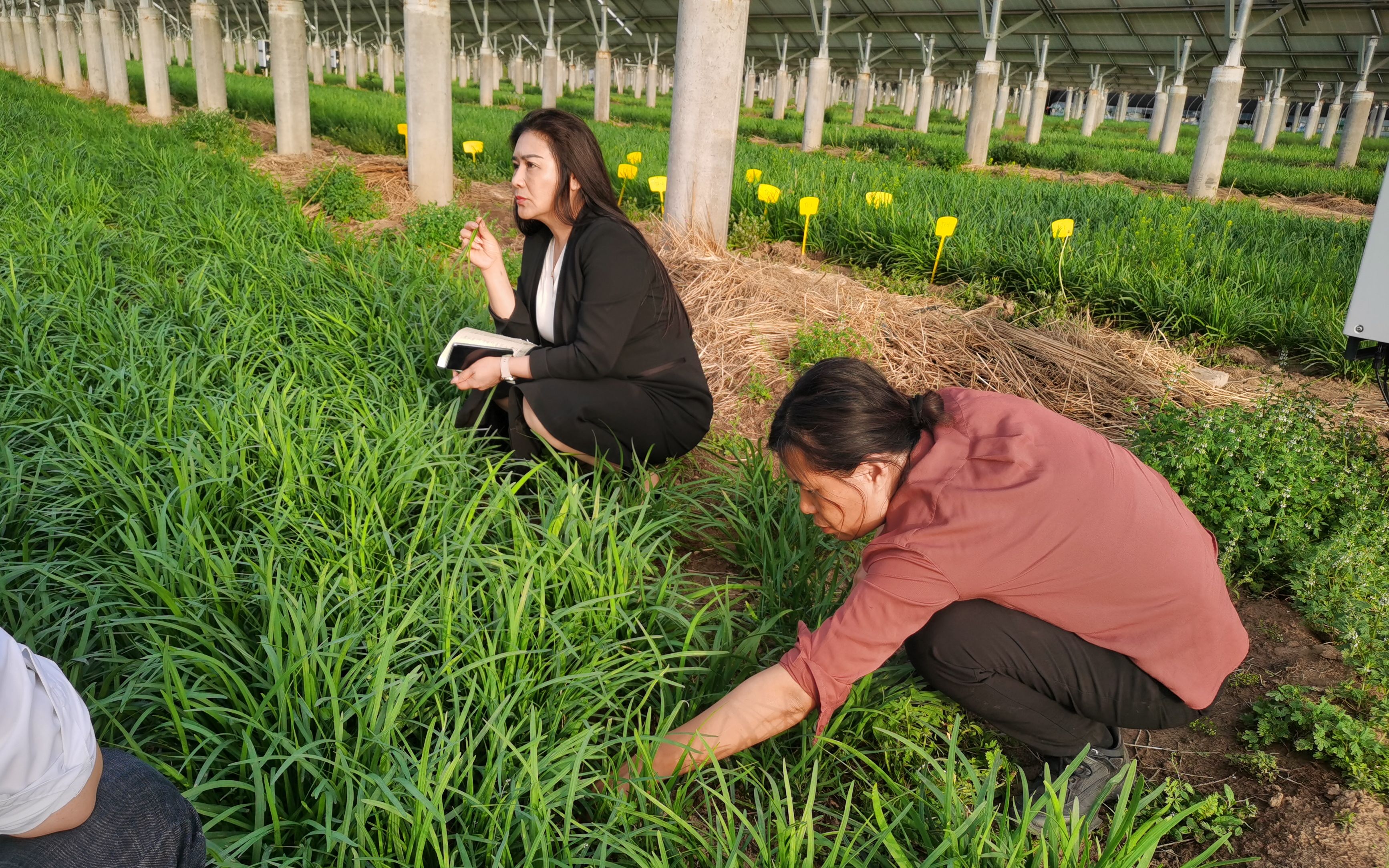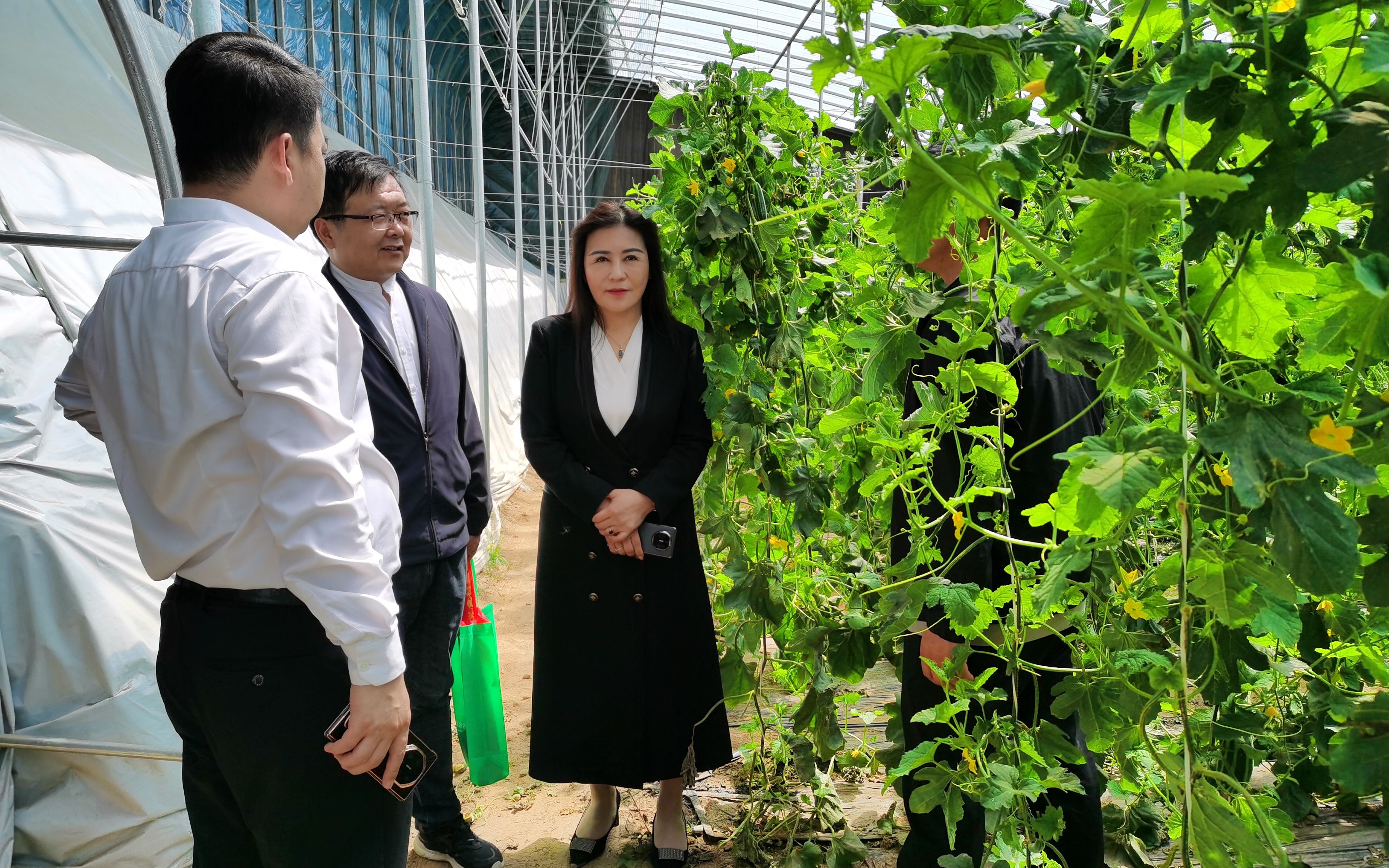 随后考察团来到饶阳县大尹村镇百里蔬菜长廊。站在大尹村镇设施农业科技服务中心的天台上,极目远眺,阳光下白茫茫的蔬菜大棚绵延开来,蔚为壮观。大棚内采用集成机械化、自动化、智能水肥一体化、太阳能风吸式杀虫灯、秸秆废弃物综合利用等新设施新技术,形成一套轻简高效、绿色安全的生产模式,让人感受农业新质生产力带来的魔力。