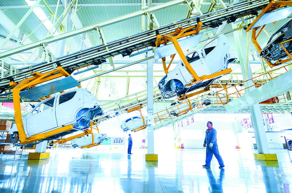 图为河北新宇宙电动车有限公司生产线上正在等待进一步装配的车身总成。