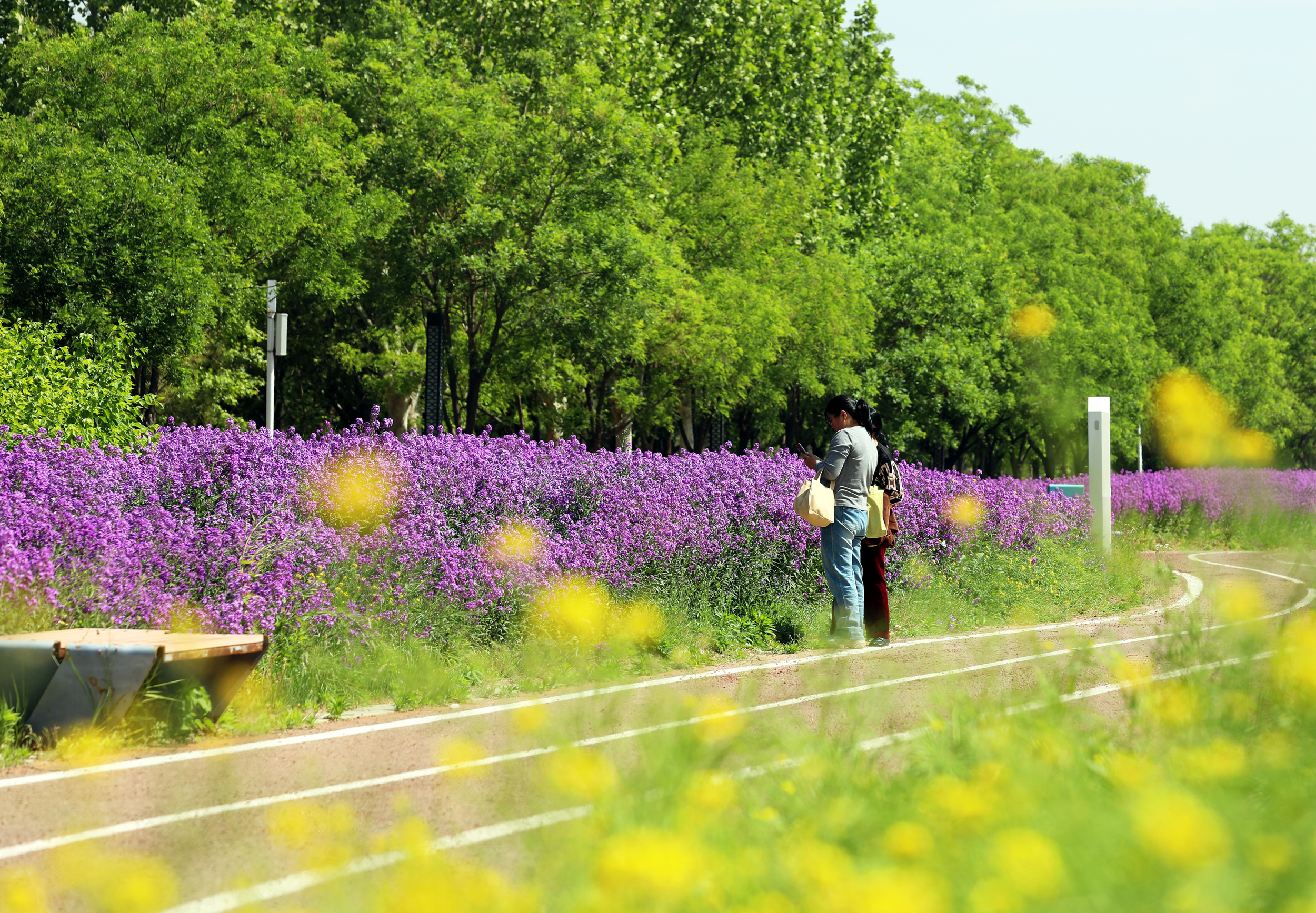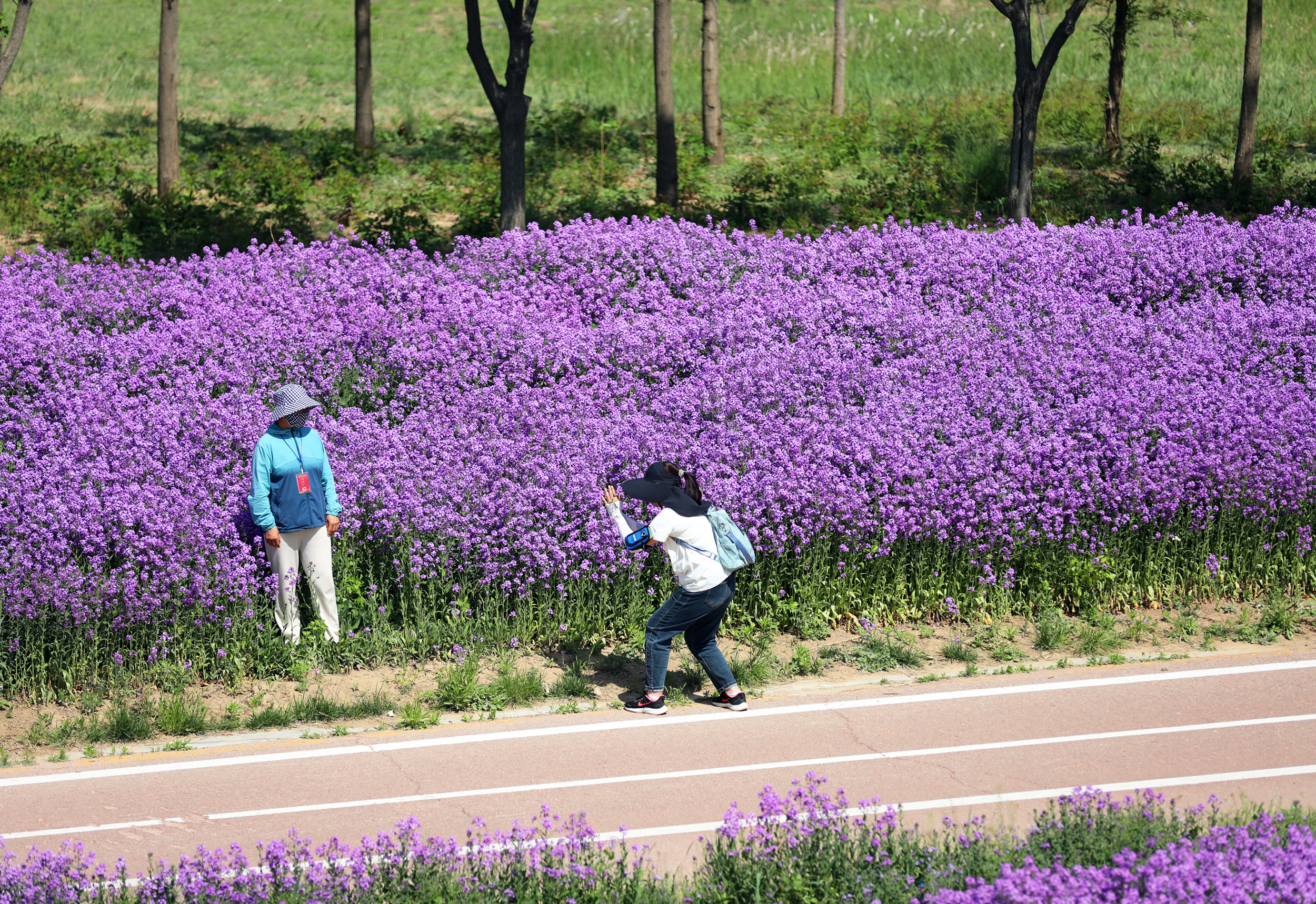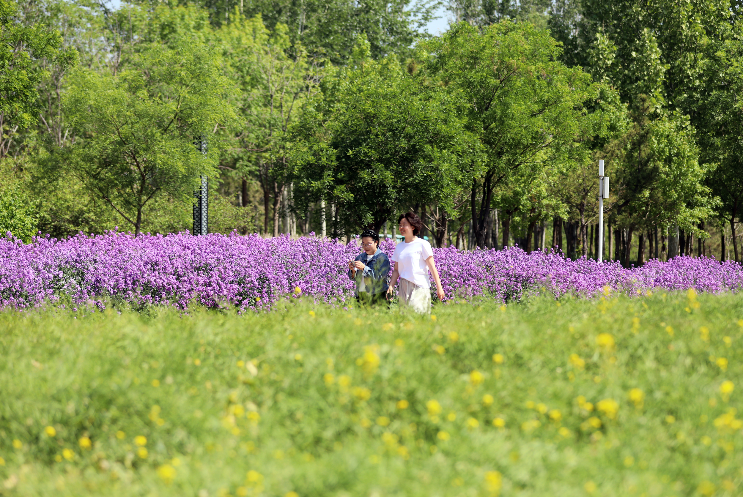 五一假期将至,衡水园博园正悄然上演一场浪漫花事。园内大片蓝香芥进入盛花期,如紫色的绒毯装点大地,成为一道绝美的风景线,吸引众多游客前来观赏游玩。