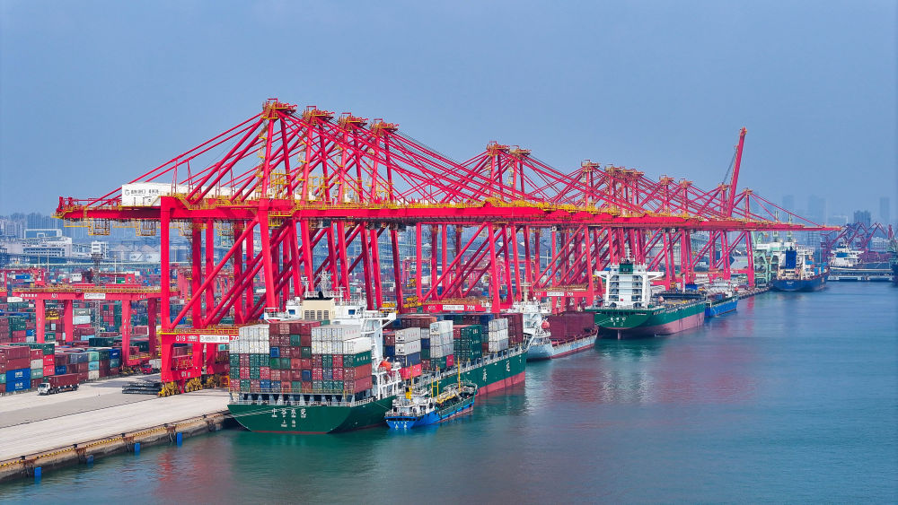 轮船在山东港口日照港集装箱码头停泊作业(无人机照片,2024年8月22日摄)。新华社记者 李紫恒 摄