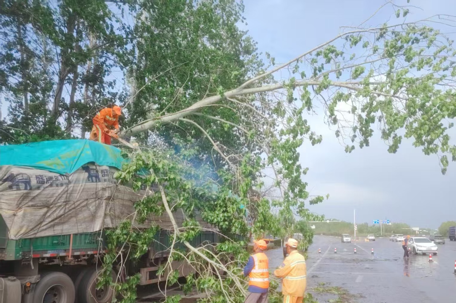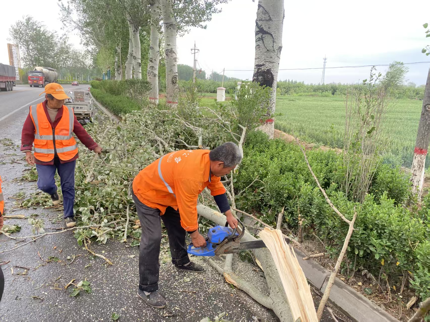 当天,雷雨大风天气出现后,部分国省干线公路沿线出现树木倒伏、断枝散落情况,严重影响道路通行安全。为确保五一假期群众出行畅通,我市各县市区养护单位立即启动恶劣天气应急响应机制,组织应急抢险队伍30分钟内到达现场,科学分析险情,迅速开展抢通。抢险人员采取“机械切割+人工清运”方式高效处置,以最快速度恢复道路畅通。