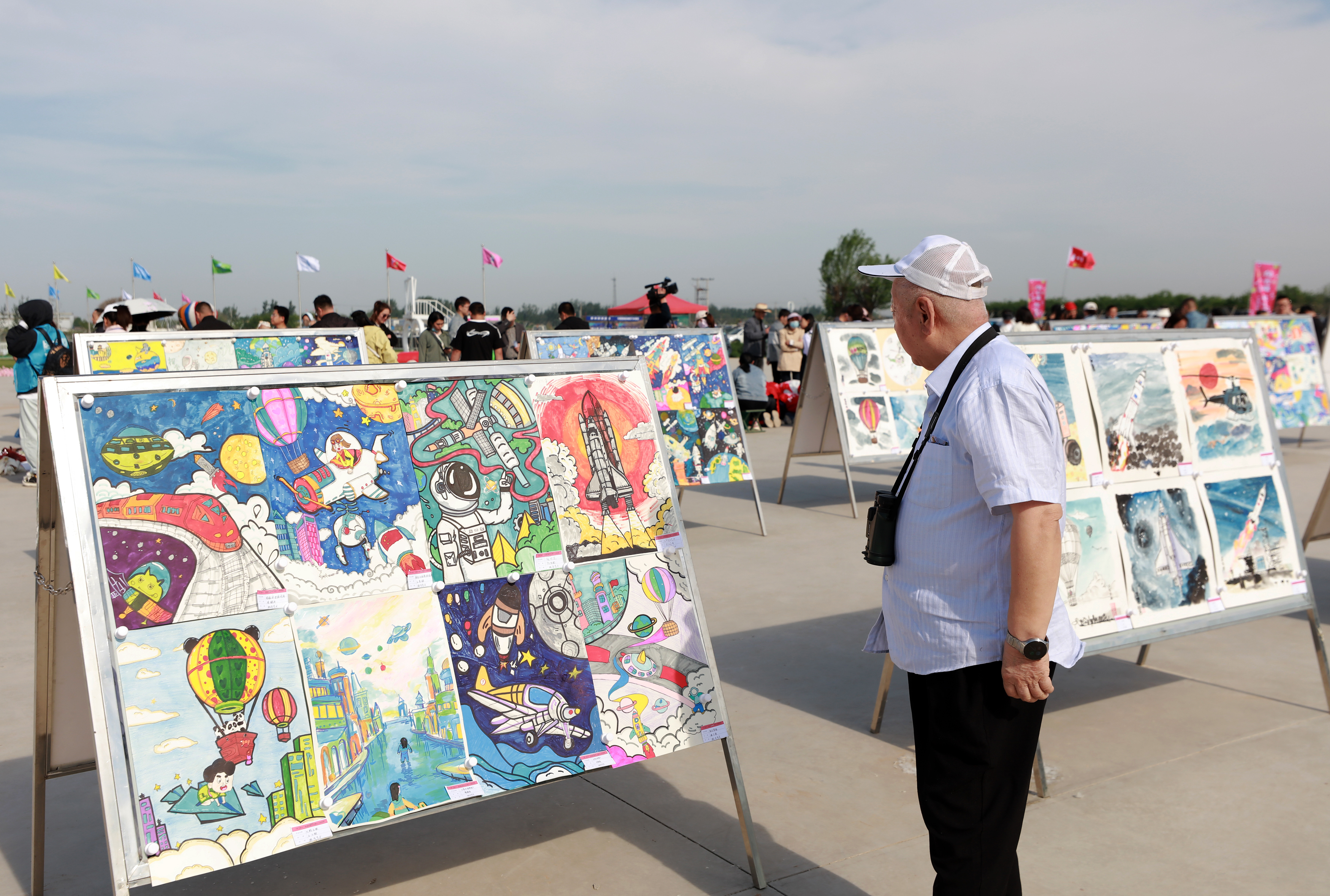 游客在桃城机场参观“梦飞蓝天”航空主题少儿绘画展。