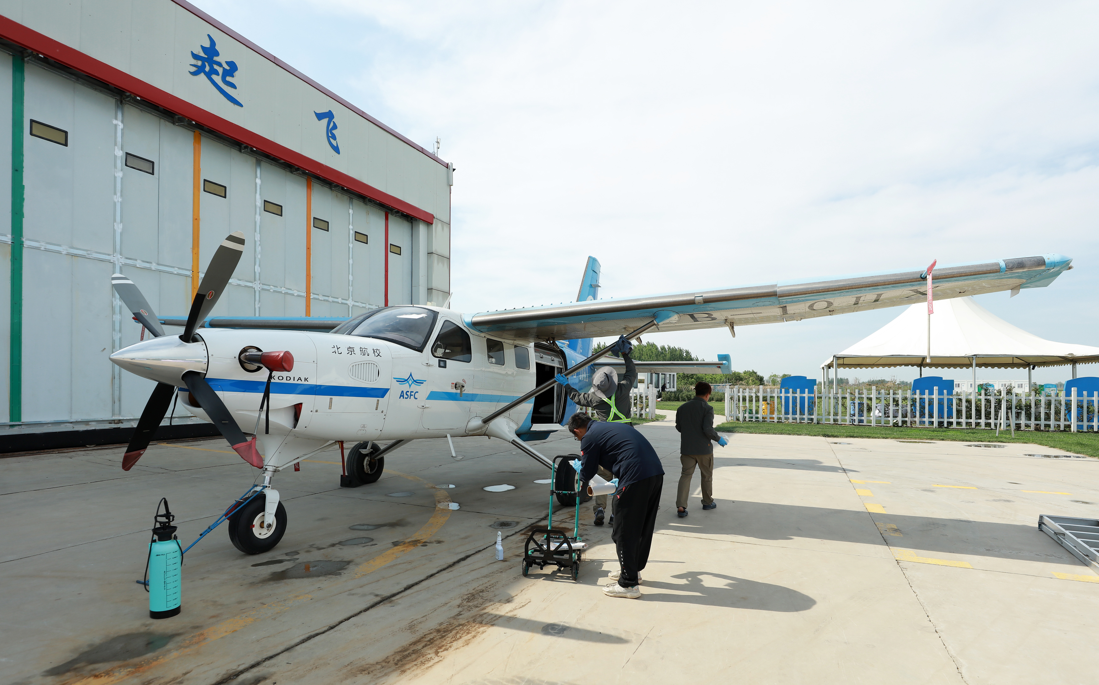 工作人员正在整备飞机。