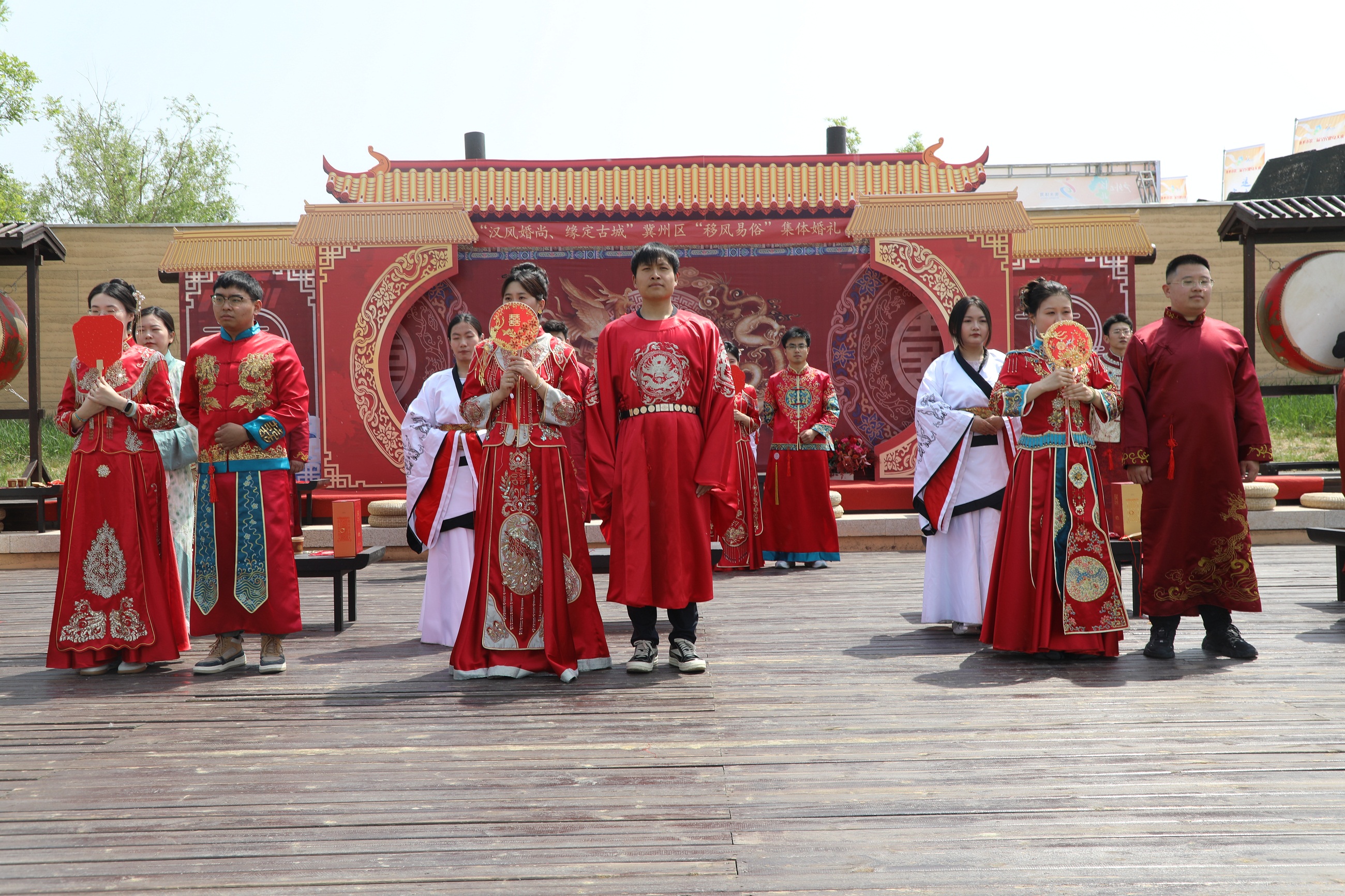 5月2日,冀州区古城遗址公园内,红绸轻舞、古乐悠扬。一场别具特色的“汉风婚尚 缘定古城”集体婚礼在此浪漫举行。10对新人身着华美汉服,在千年古城遗址的见证下,以传统汉式婚礼喜结连理,用文明简约的方式演绎爱情誓言,践行移风易俗新风尚。