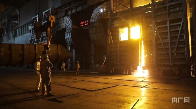 炼钢转炉车间生产现场,钢花飞舞(央广网记者 王艺霖 摄)