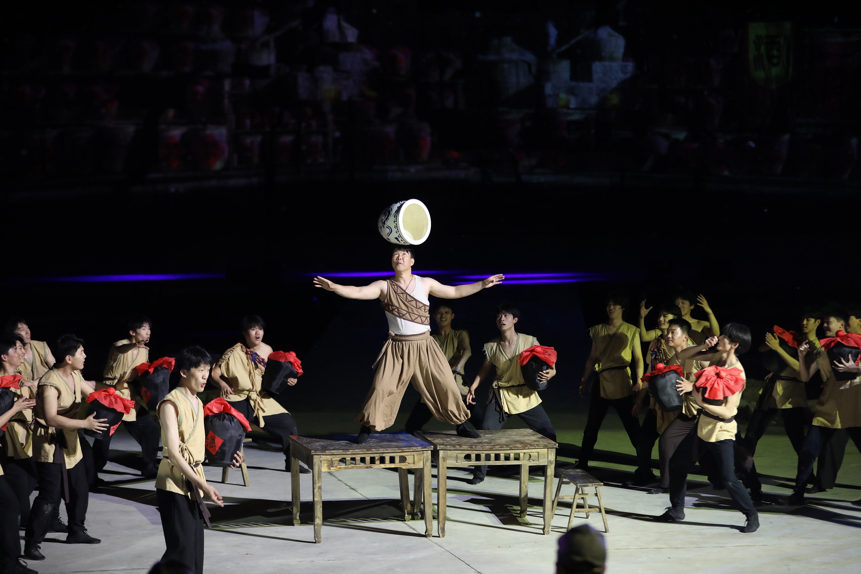 暮色降临,少儿武术团的精彩开场瞬间点燃现场气氛。演出以大禹治水为开篇,全息投影与群舞演员配合,生动再现了宏大治水场景。随着剧情推进,董仲舒、北魏冯太后等历史人物依次登场,带领观众穿越千年历史。