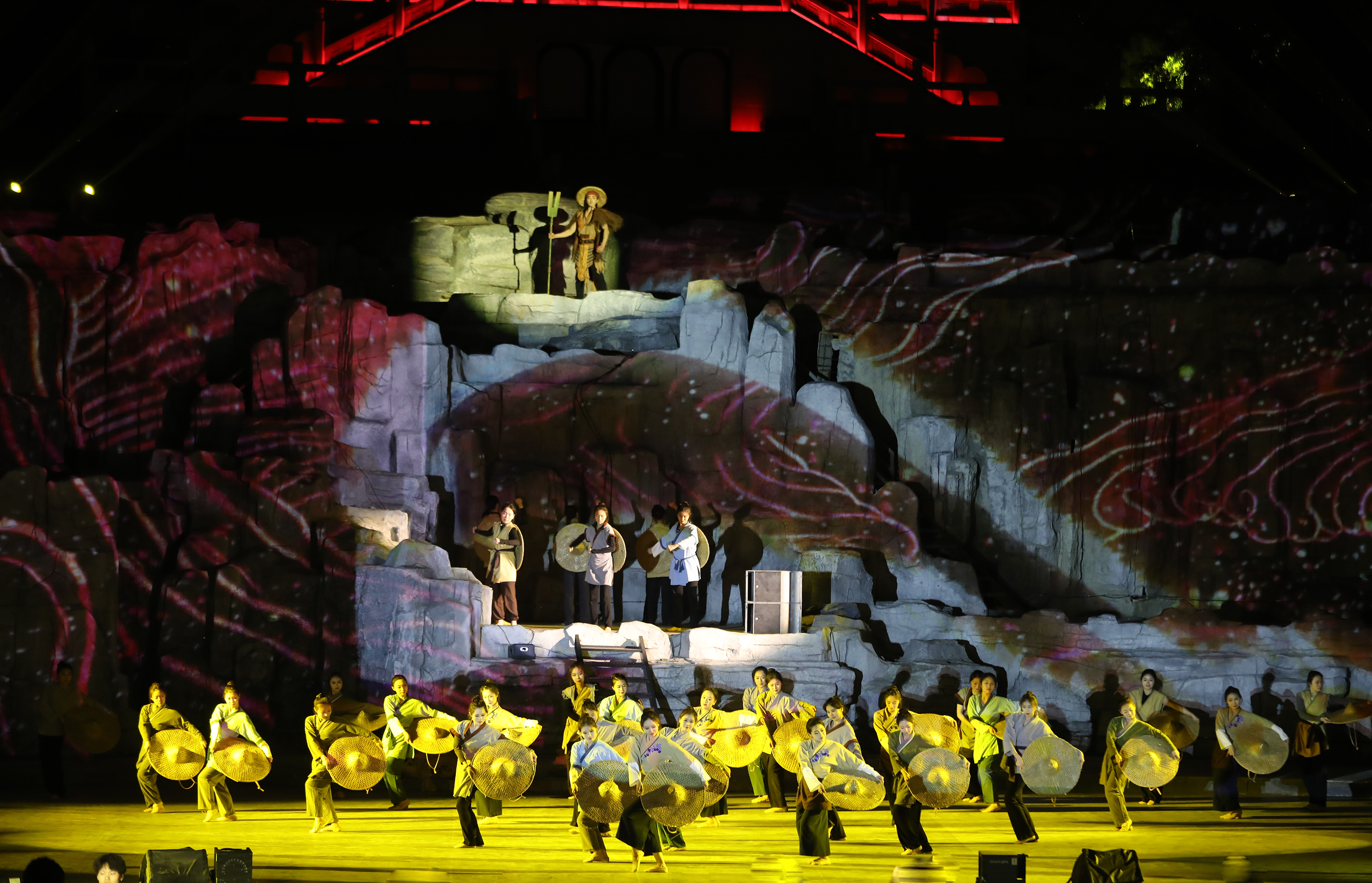 “黄河泛滥成汪洋……九州划定冀为首,鼎立龙兴万古长。”伴着厚重悠扬的旁白,这场以大禹治水开篇的演出正式开始。全息投影中,九州版图渐次浮现,大禹巍然屹立山间,汹涌的洪水也未能撼动其分毫,数十名群舞演员手持工具、衣袂翻飞,似与怒涛搏斗,重现“披九山,通九泽,决九河,定九州”的史诗场景。观众仿佛置身于四千年前治水的恢宏现场,触摸着华夏文明起源的脉搏。