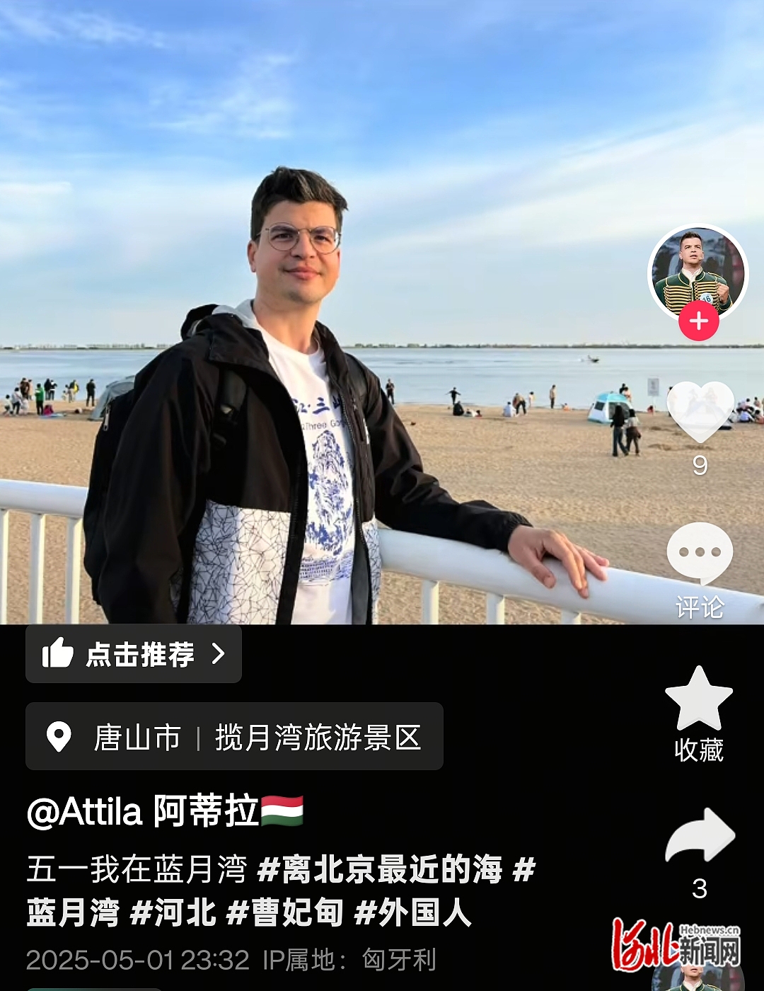 除此之外,唐山河头老街的宏伟景观同样让外国游客赞叹不已,"比我想象中还要宏伟,还要漂亮!"一位匈牙利游客在自己拍摄的视频中赞叹道。一位在河北唐山生活的匈牙利友人也在短视频平台分享了他的打卡照,“五一,我在唐山揽月湾。”