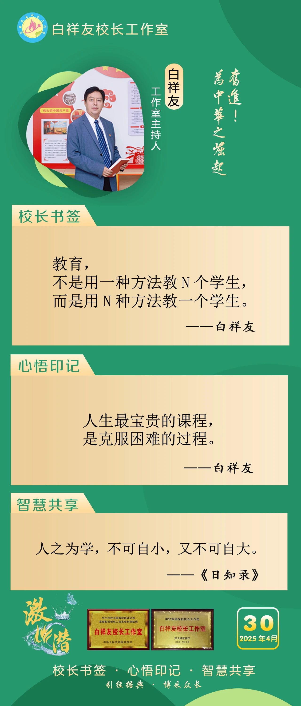 “白祥友校长工作室”成立于2019年4月,是教育部“国培计划”中小学名校长领航工程、河北省首批名校长工作室,目前省内外成员校59所。工作室坚持“资源共享、智慧共融、互助共赢”理念,已成为思想碰撞的交流场,资源共享的品牌站,成果展示的辐射源。