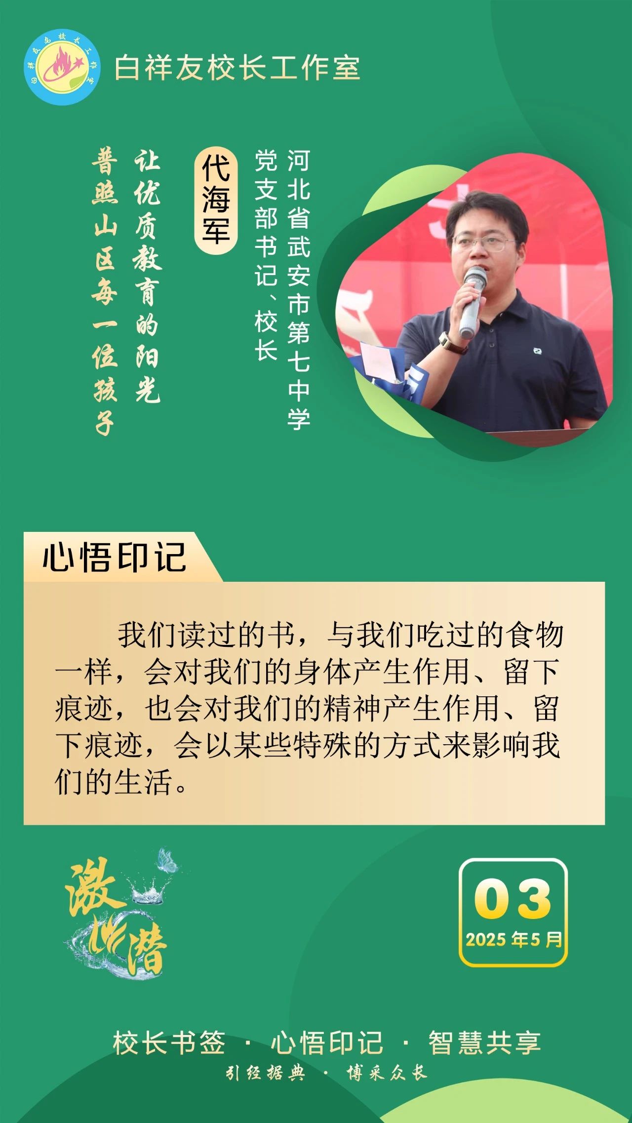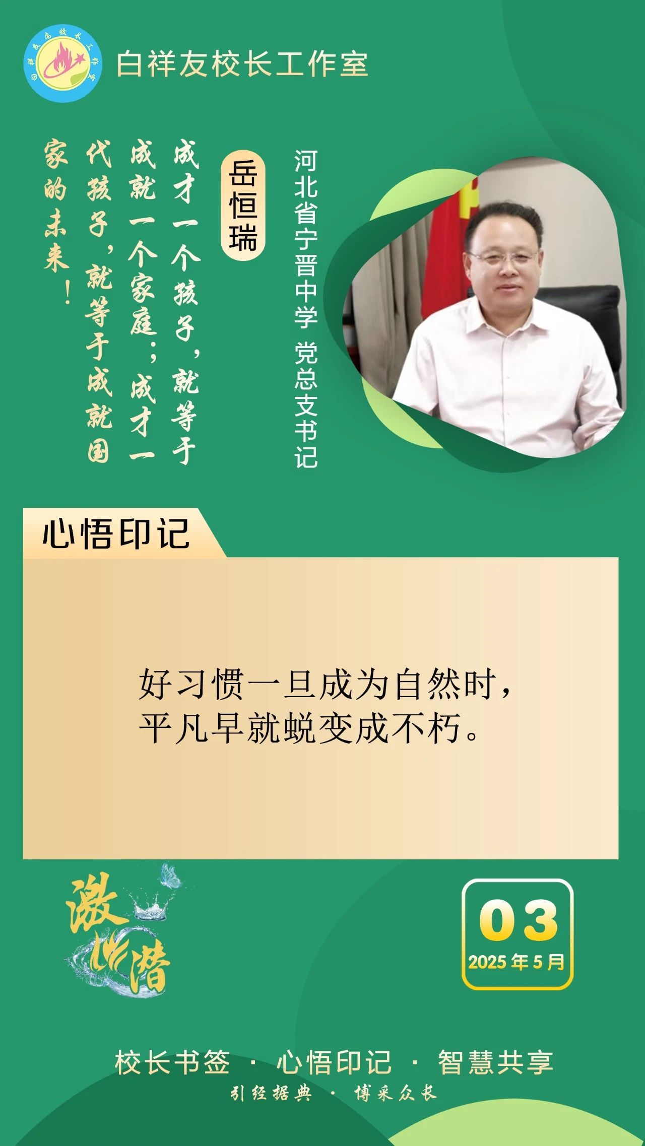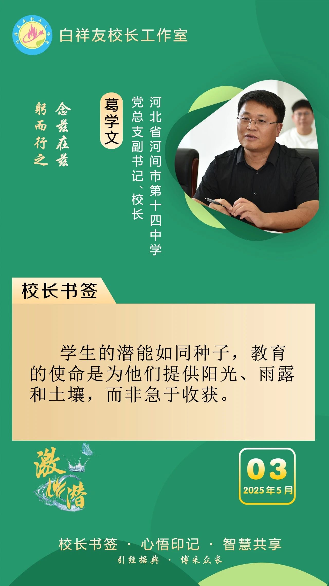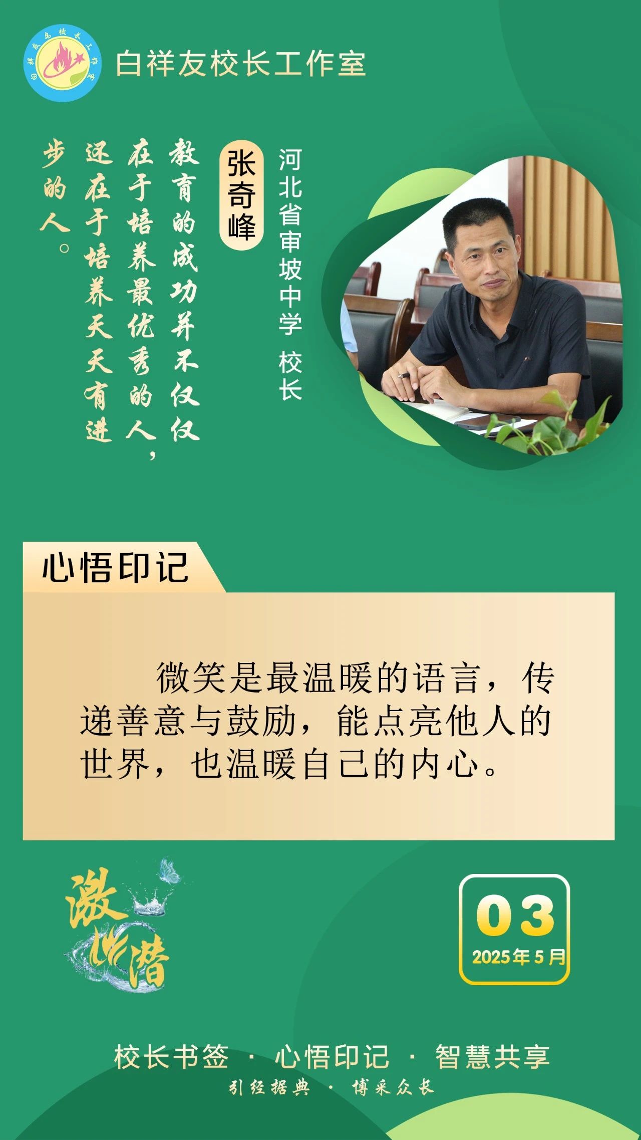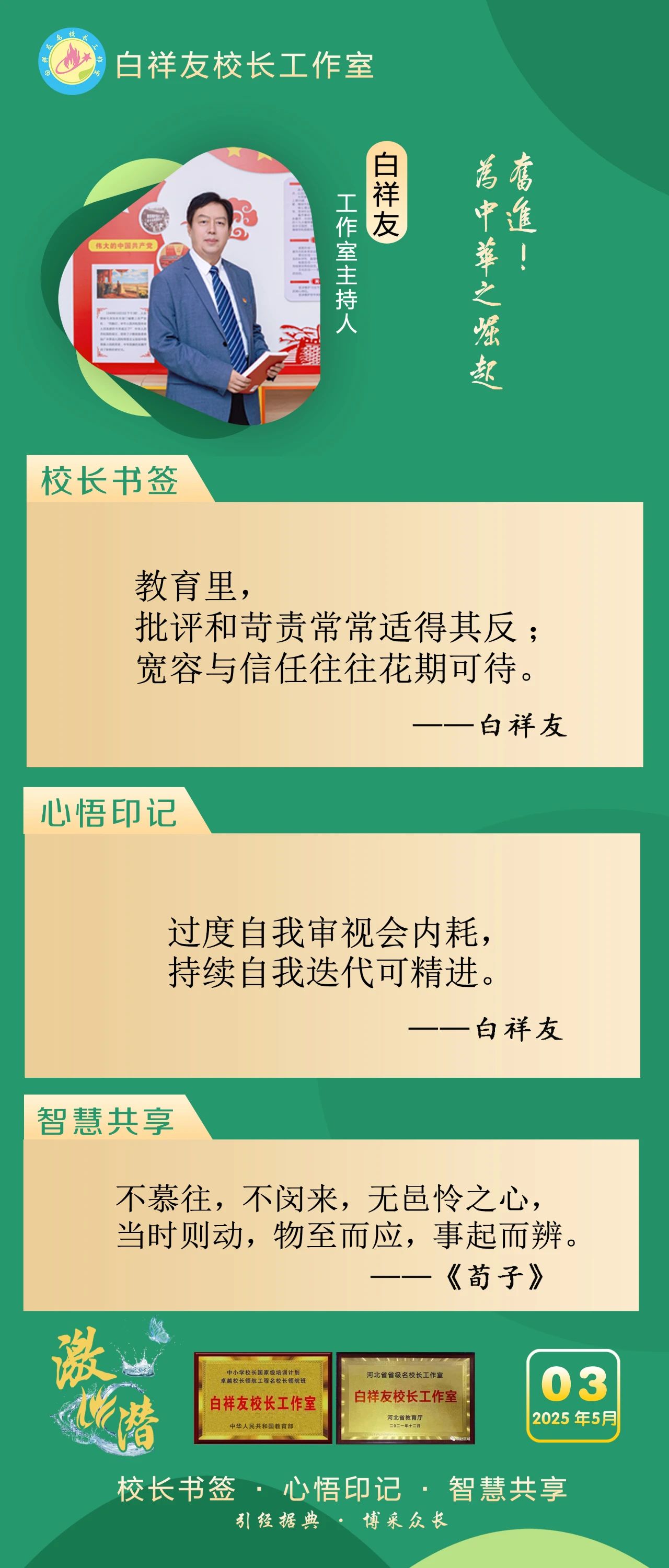 “白祥友校长工作室”成立于2019年4月,是教育部“国培计划”中小学名校长领航工程、河北省首批名校长工作室,目前省内外成员校59所。工作室坚持“资源共享、智慧共融、互助共赢”理念,已成为思想碰撞的交流场,资源共享的品牌站,成果展示的辐射源。