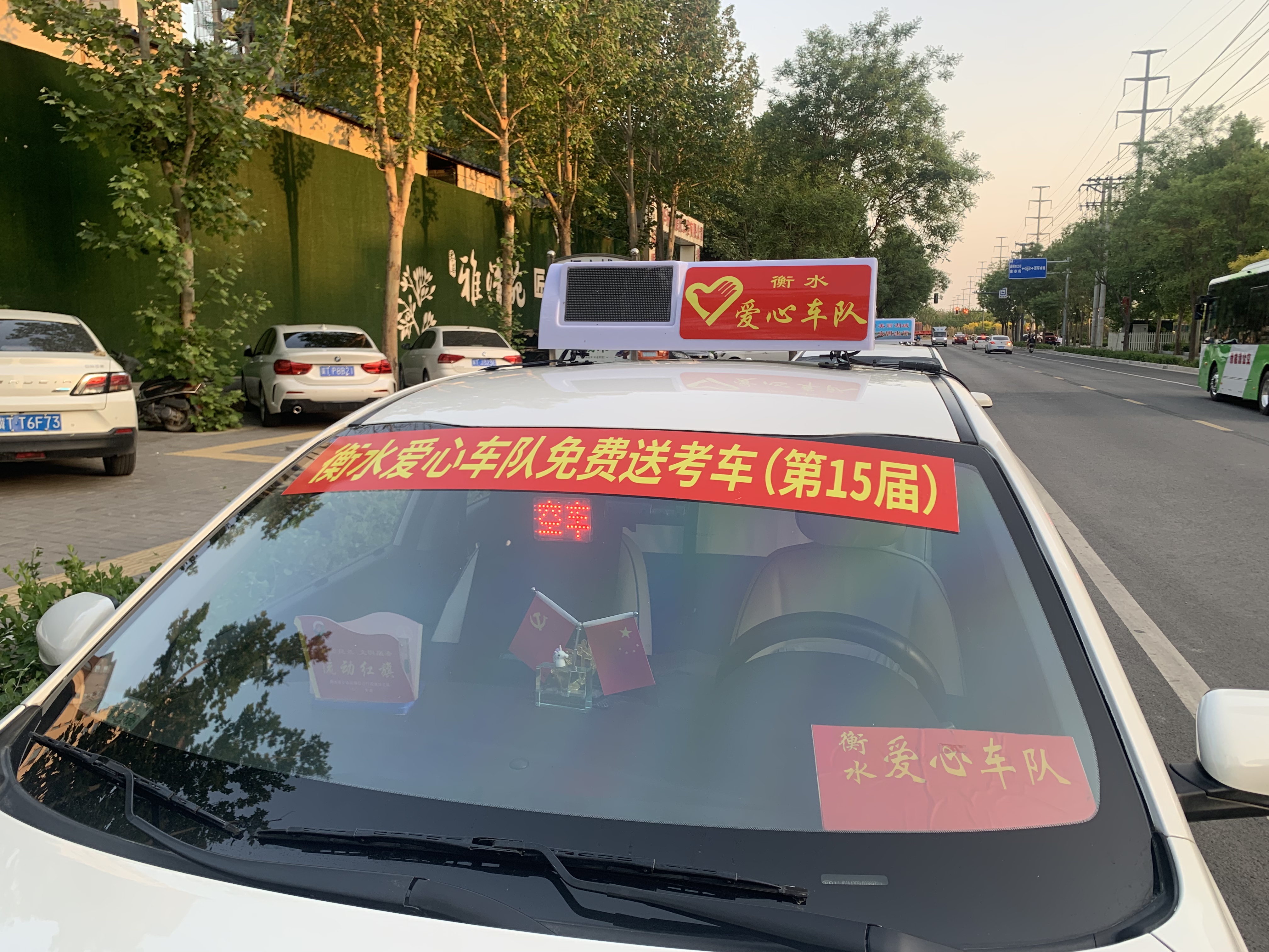 今年,衡水爱心车队的30辆“爱心送考”出租车会统一贴标装饰,每辆出租车顶灯都标有“衡水爱心车队”字样,前挡风玻璃贴有“衡水爱心车队免费送考车(第15届)”贴标。