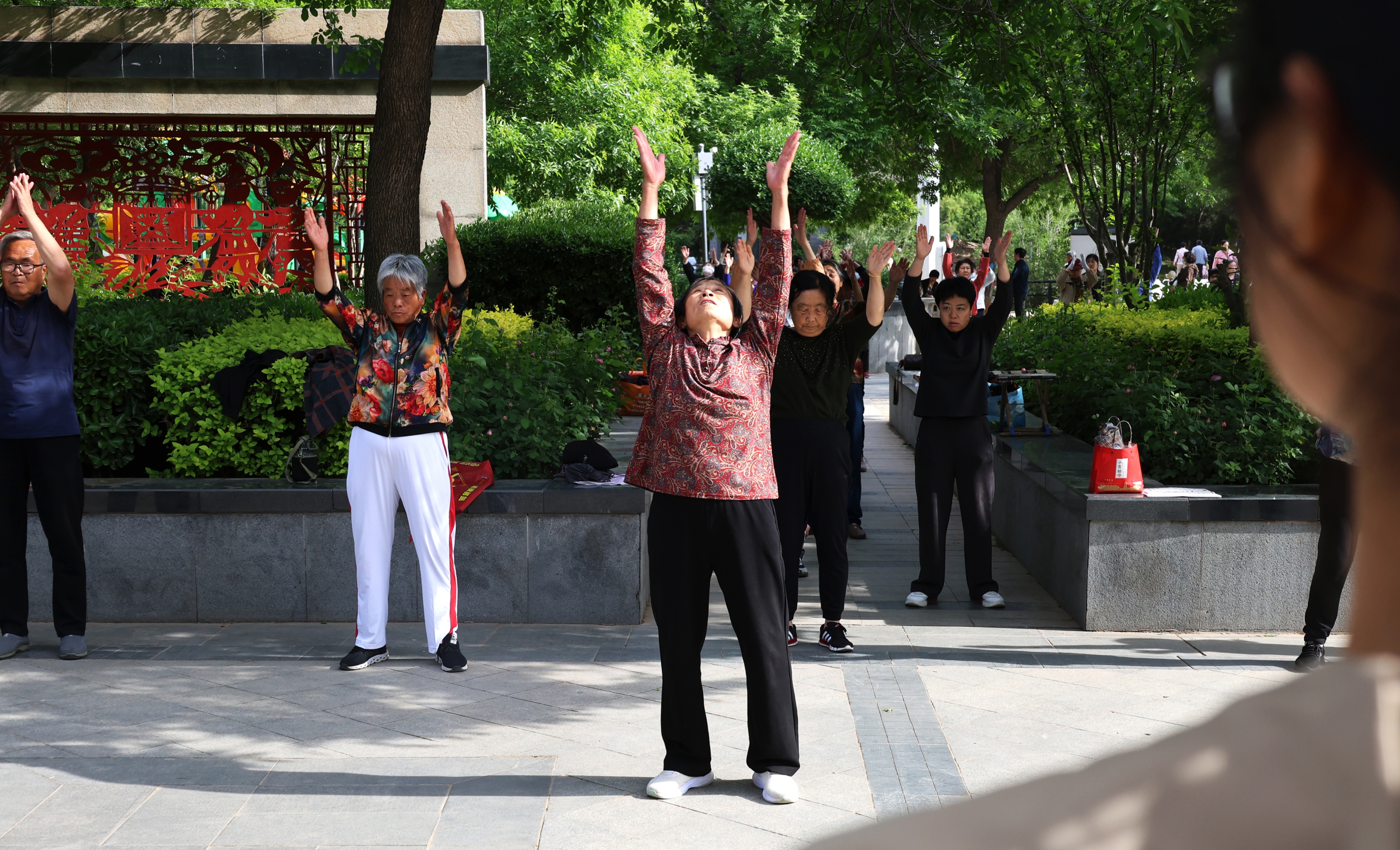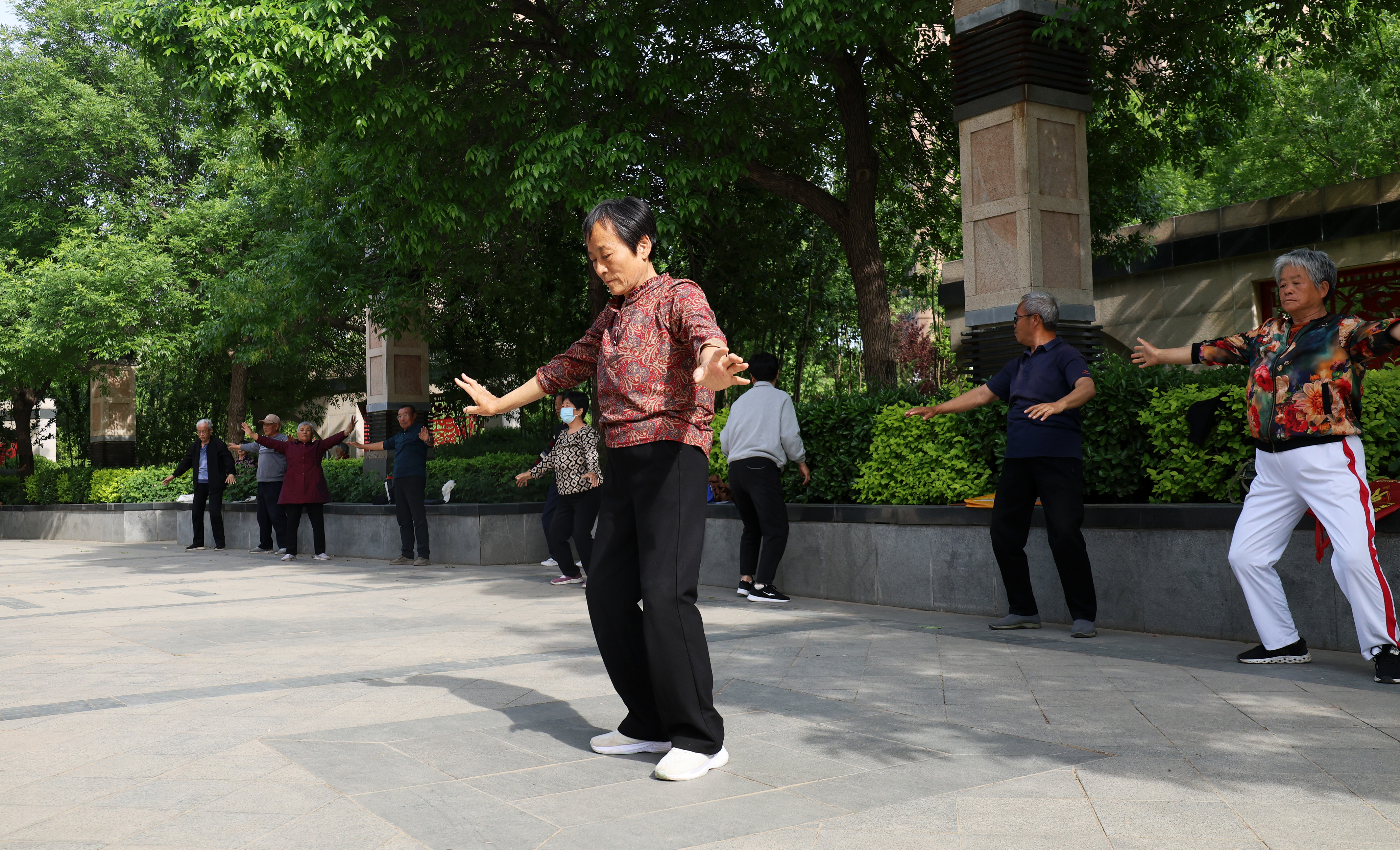“来啦!今天咱们先拍八虚,热热身!”王荣英站在队伍最前端,脊背挺得笔直。她的手掌拍向大腿外侧时,发出干脆的“啪”声,带动身后一百多名老人同步击掌。抬腿、扭腰、旋臂,每个动作都带着超越年龄的利落。“注意拍这里!”她时不时提高声调,声音铿锵有力。
