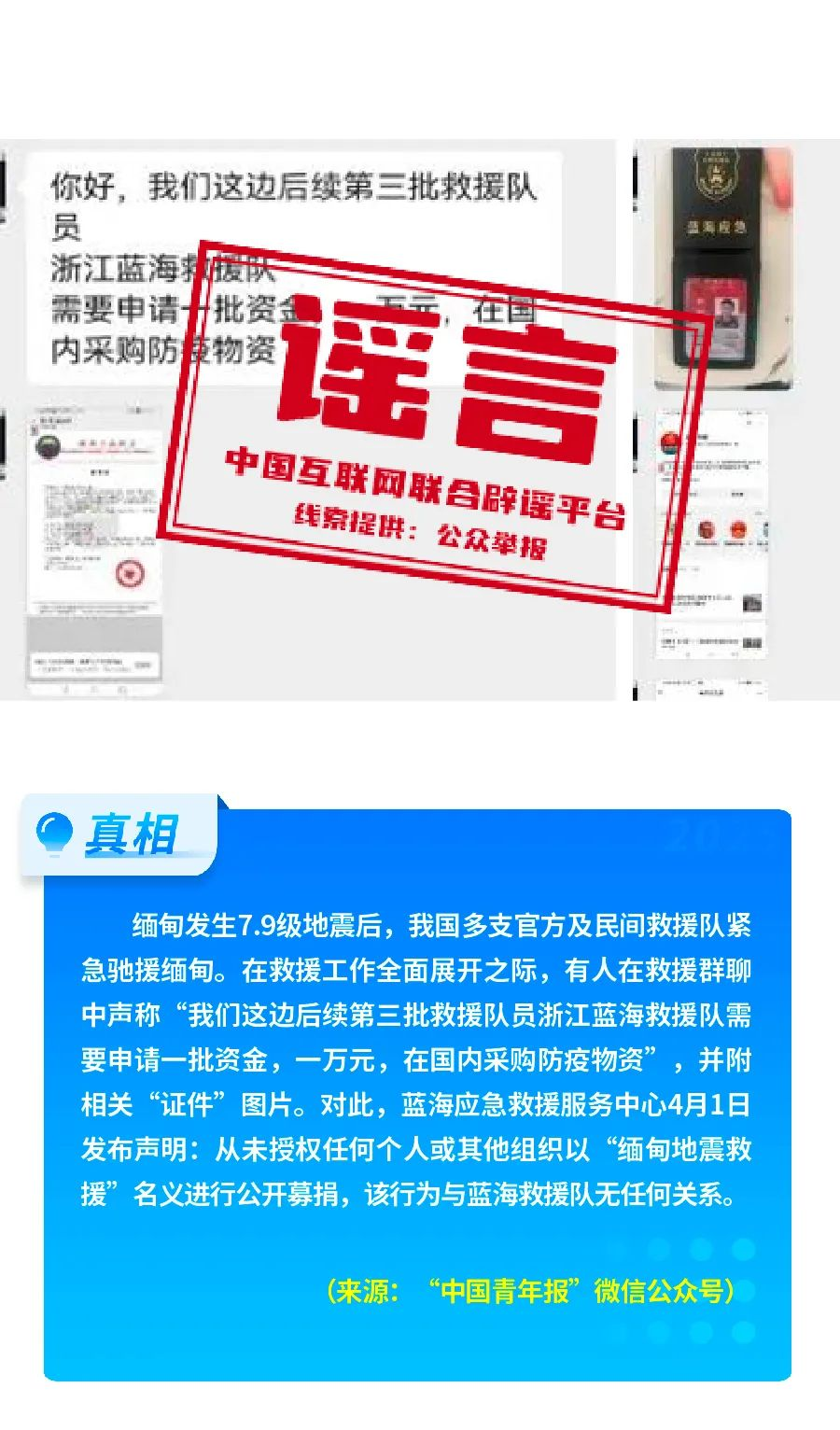 炮制社会热点,制造舆论恐慌。4月,涉灾害事故类谣言“无中生有”虚构灾情、“移花接木”夸大损失,故意制造恐慌,造成不良社会影响。如某网民为博眼球,编造“重庆一工业园区着火,10人遇难上百人失联”的火灾谣言,引发社会恐慌。还有人利用缅甸7.9级地震的舆论热度,在群聊中伪造证件图片,谎称“中国赴缅甸救援队需募集资金,采购防疫物资”,企图骗取善款;还有人编造同期我国多地发生地震,受灾情况严重。此类谣言可能降低民众对国家应急救援体系的信任,严重干扰社会稳定。