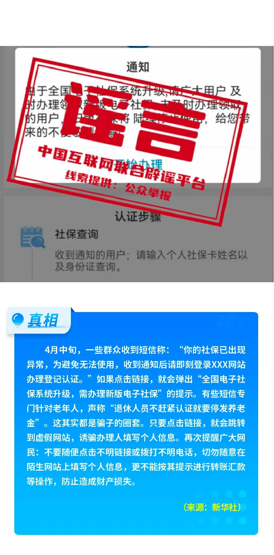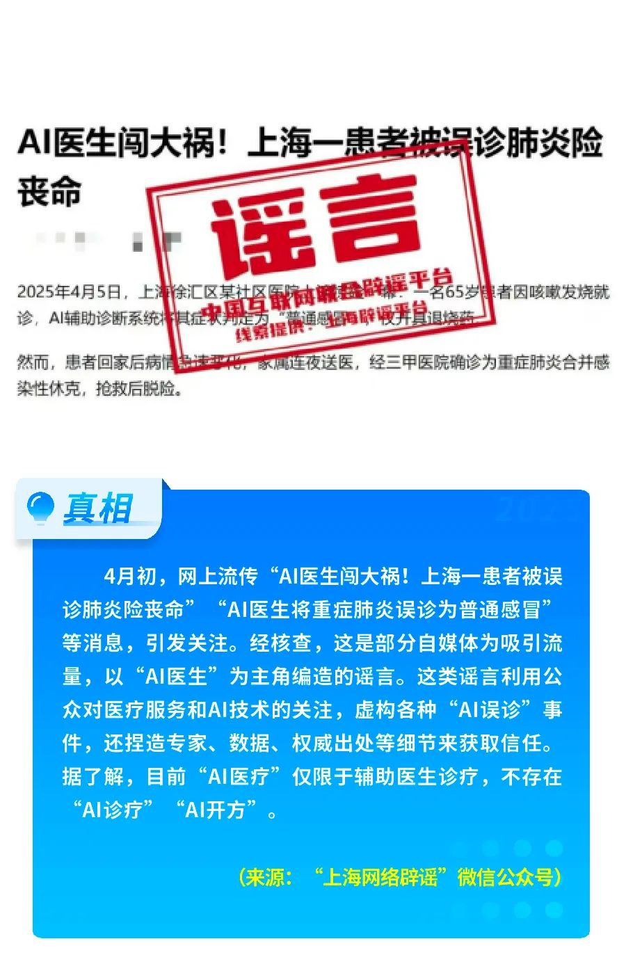 炒作民生话题,扰乱社会秩序。4月,涉民生领域谣言多发,个别不法分子针对群众关心的社保、教育、医疗、就业等话题散布误导性信息。诈骗分子假冒人社部门,编造“社保账号状态异常,需速办登记认证”的话术,诱导老年人填写个人信息,伺机实施钓鱼诈骗。“2025年佛山全面取消入学限制”一文,对佛山教育招生政策进行“断章取义”式解读,用“无社保、无房产可入户入学”博取关注,误导公众认知。“上海一患者被AI误诊重症肺炎险丧命”的假消息,虚构“AI医生独立诊疗”场景,渲染AI技术应用风险,拉低民众对医疗服务信任度。所谓“外卖平台禁止45岁以上的骑手接单”不实信息,属于旧谣新传,造谣者以炒作骑手“年龄焦虑”博取眼球,煽动负面情绪。