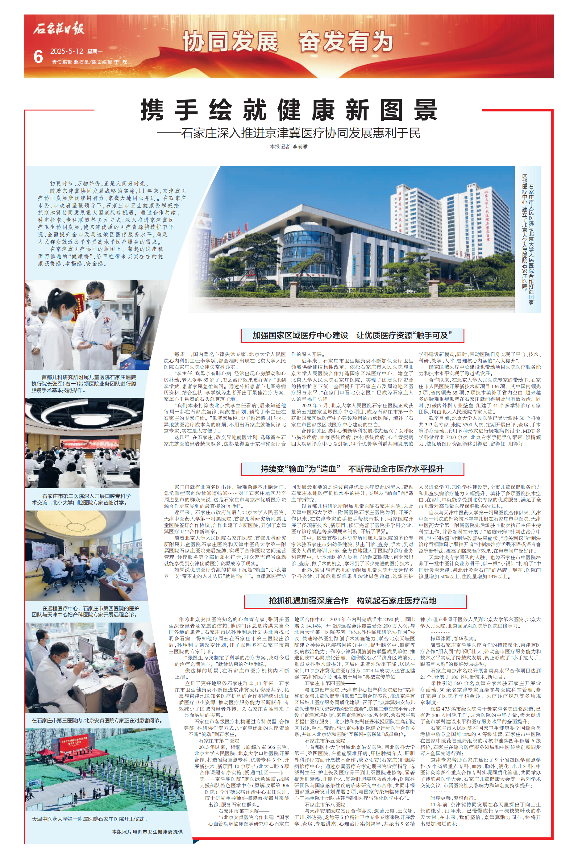 随着京津冀协同发展战略的实施,11年来,京津冀医疗协同发展步伐铿锵有力,京畿大地同心并进。在石家庄市委、市政府坚强领导下,石家庄市卫生健康委积极抢抓京津冀协同发展重大国家战略机遇,通过合作共建、科室托管、专科联盟等多元方式,深入推进京津冀医疗卫生协同发展,使京津优质的医疗资源持续扩容下沉,全面提升全市及周边地区医疗服务水平,满足人民群众就近公平享受高水平医疗服务的需求。