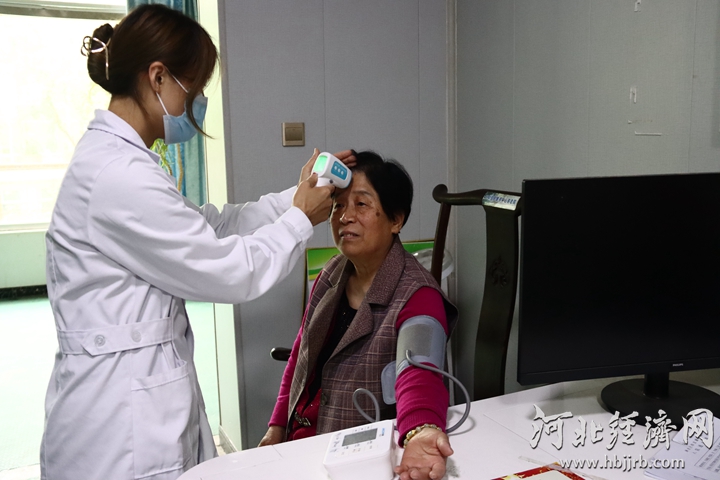 天和宜康医院医生为入住老人测量血压和测体温。康江涛 摄