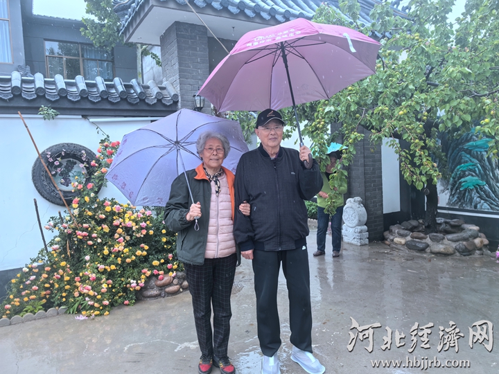 在北郭下村养老微院1号院门口,来自北京的老人李培兰(左)与老伴合影留念。河北经济日报记者 吴新光 摄