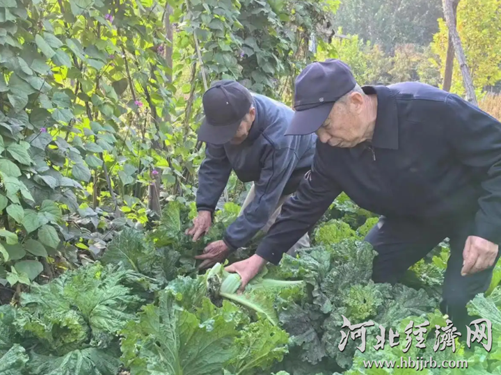 涞水县北郭下村天和宜居康养中心的老人来到菜园采摘蔬菜。