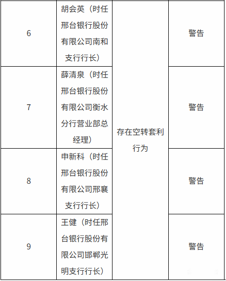 因存在空转套利行为,胡会英(时任邢台银行南和支行行长)、薛清泉(时任邢台银行衡水分行营业部总经理)、申新科(时任邢台银行邢襄支行行长)、王健(时任邢台银行邯郸光明支行行长)四人受到警告。