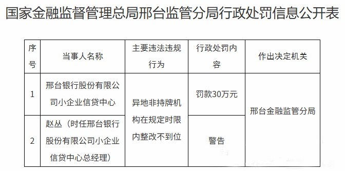 邢台银行小企业信贷中心也受到处罚。由于异地非持牌机构在规定时限内整改不到位,邢台银行小企业信贷中心被罚款30万元,赵丛(时任邢台银行股份有限公司小企业信贷中心总经理)受到警告。