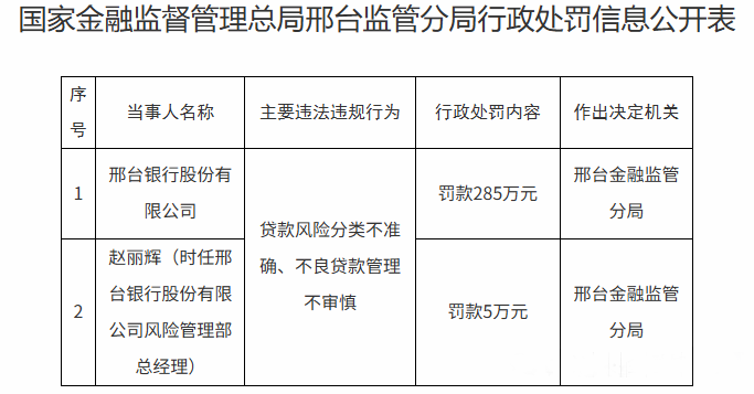 此外,邢台银行还因贷款风险分类不准确、不良贷款管理不审慎被罚款285万元,赵丽辉(时任邢台银行股份有限公司风险管理部总经理)被罚款5万元。