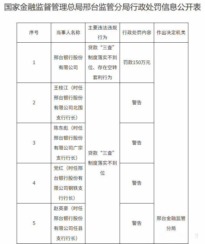 因贷款“三查”制度落实不到位,王桂江(时任邢台银行北围支行行长)、陈东彪(时任邢台银行广宗支行行长)、党红(时任邢台银行钢铁支行行长)、赵英豪(时任邢台银行任县支行行长)四人受到警告。