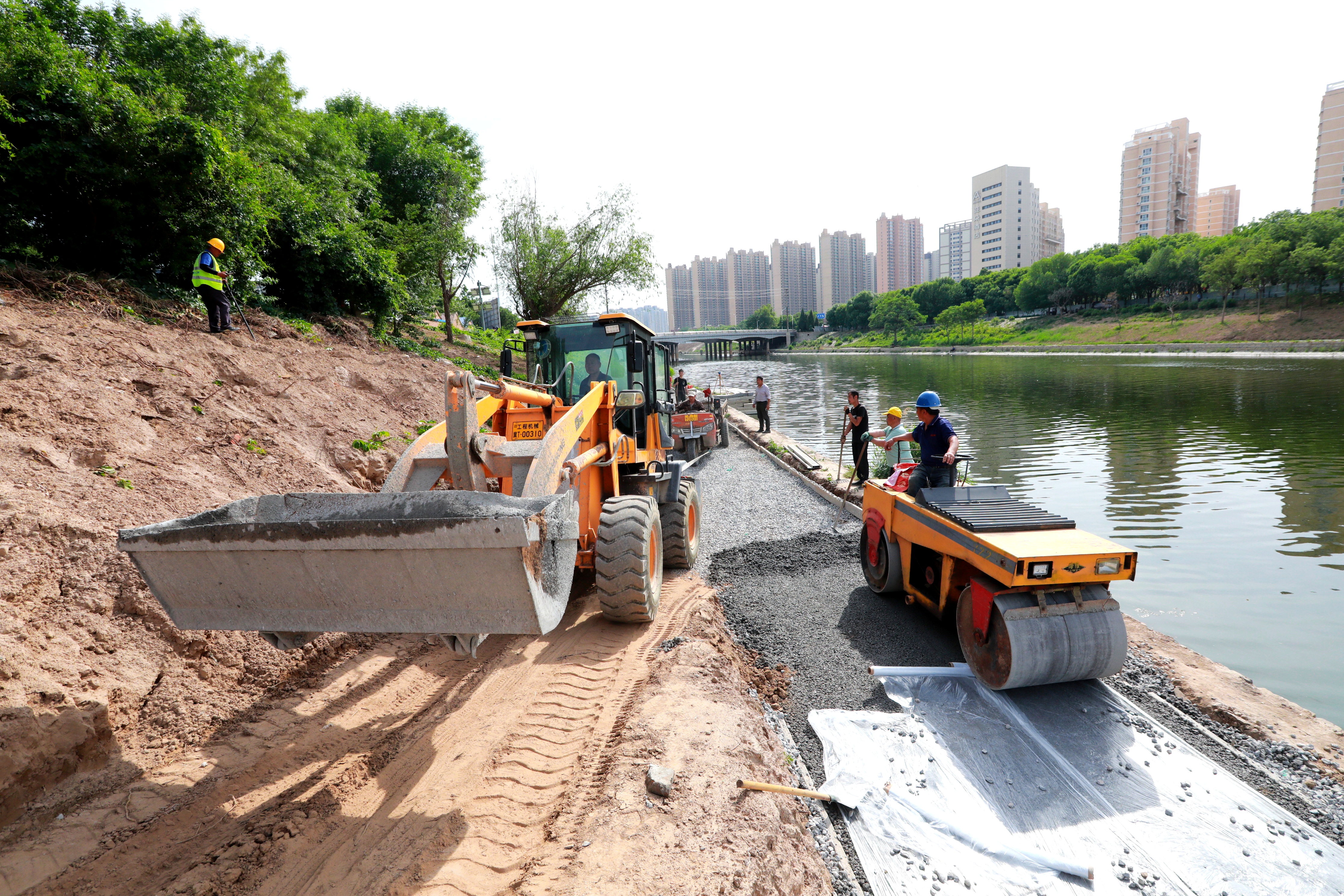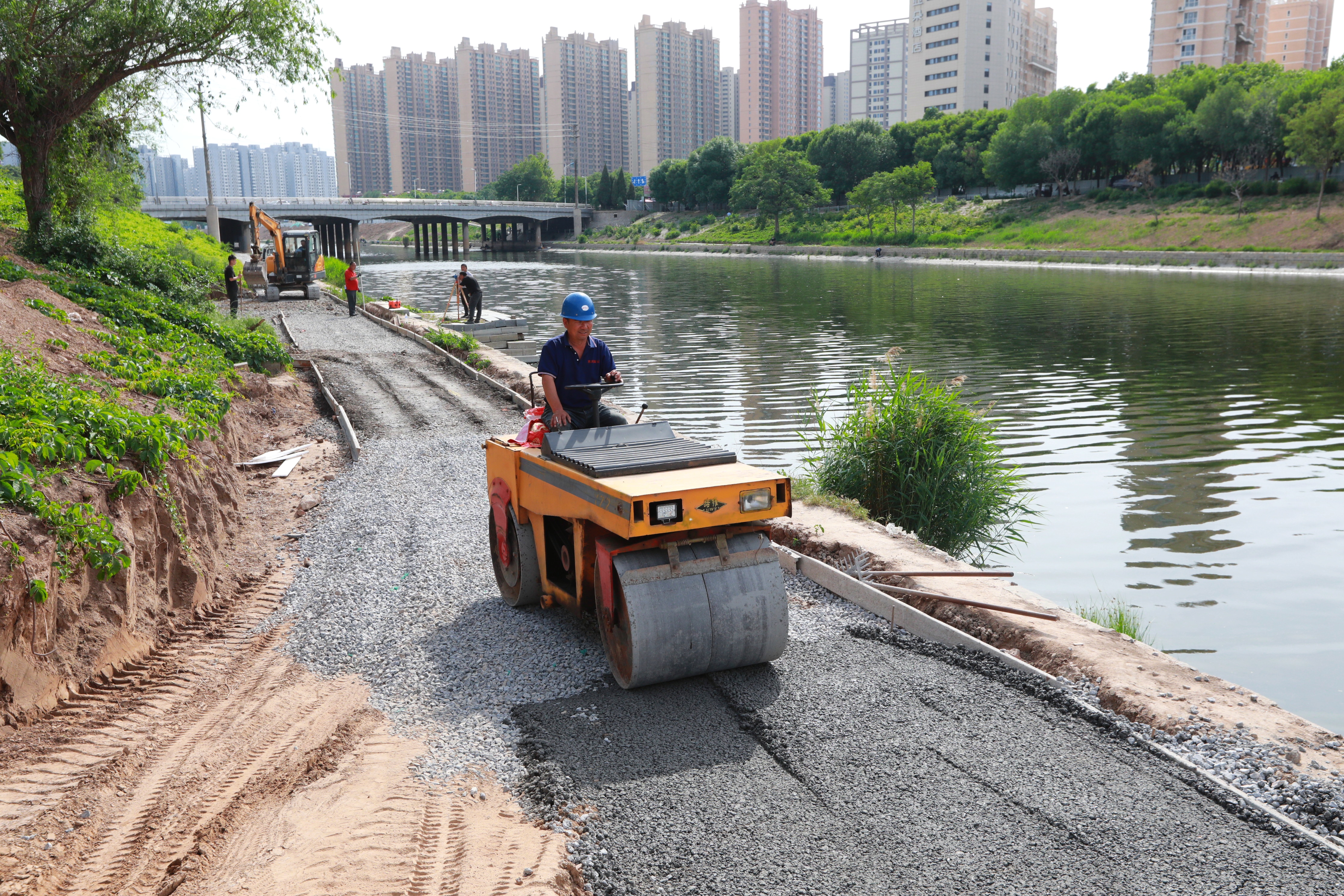 5月15日,在市区滏阳河畔挖掘机、压路机等机械设备轰鸣作业,施工人员正在对沿河亲水步道进行路面改造。