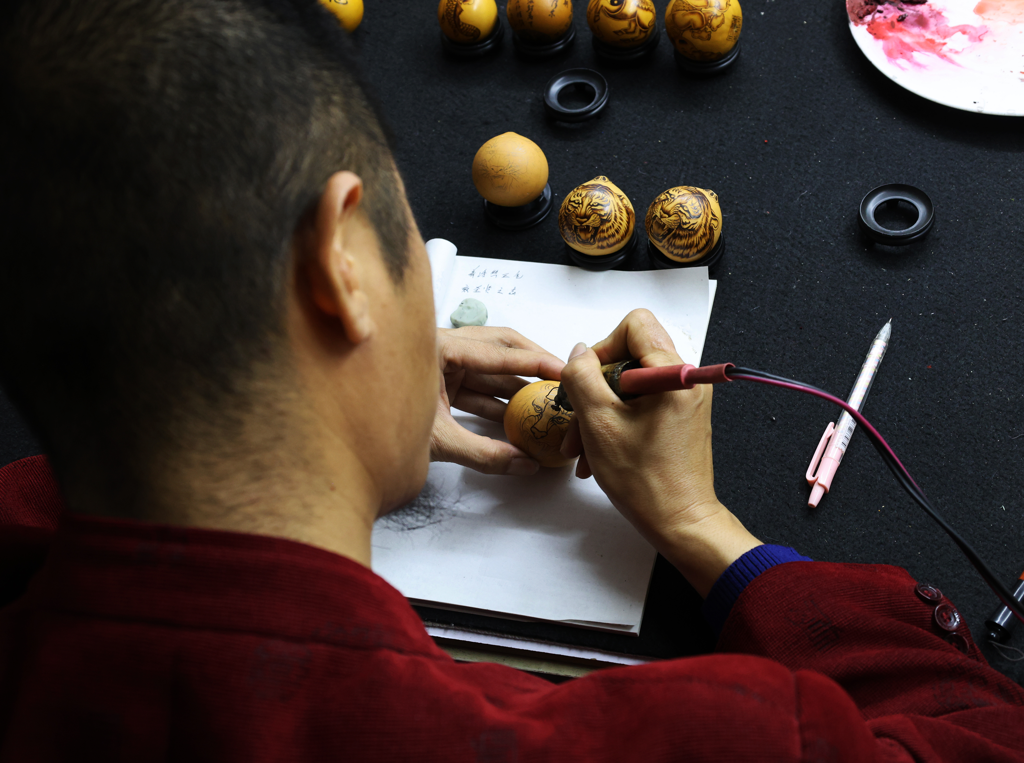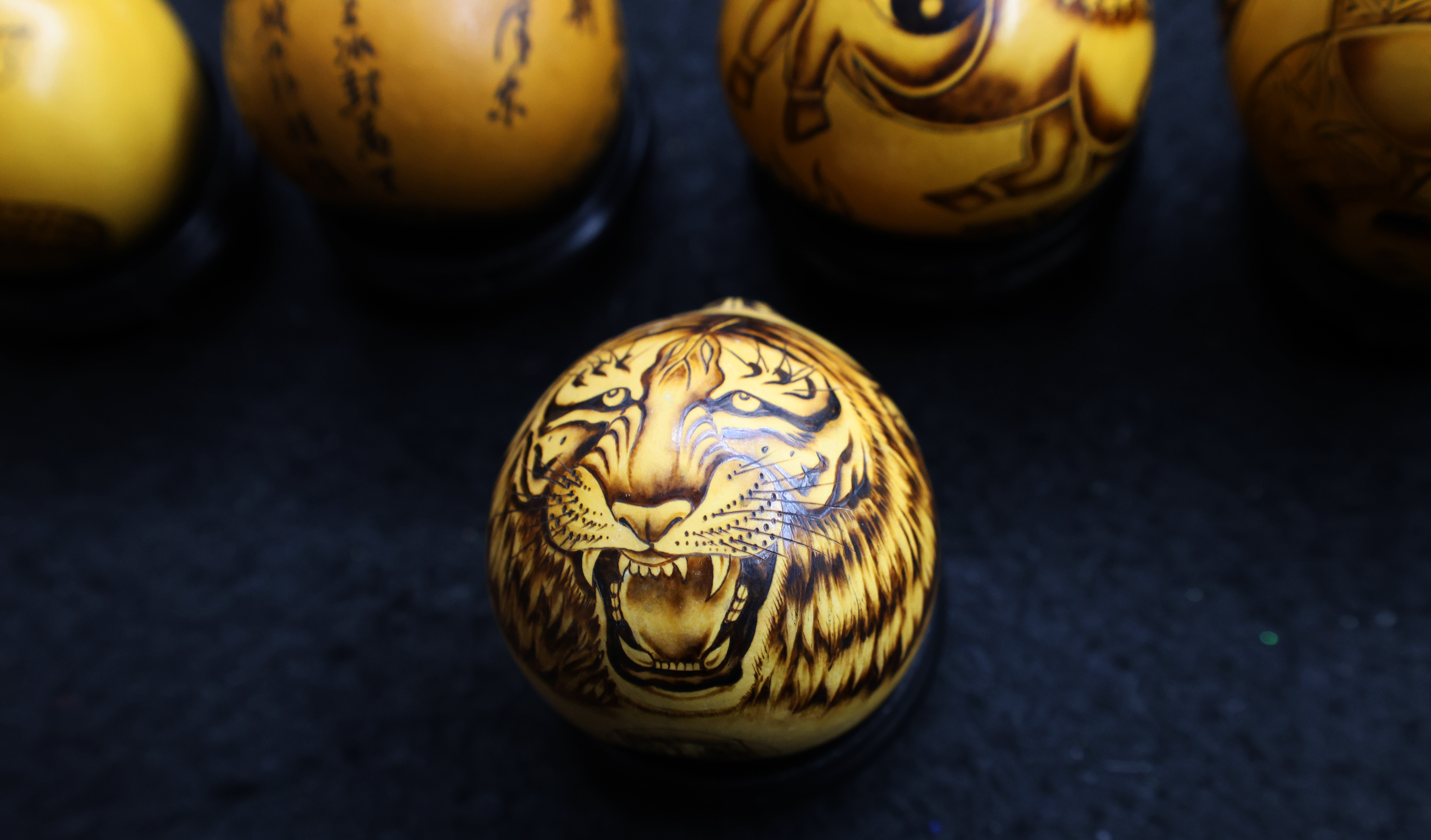 说起与烙画的缘分,何胜旺打开了“话匣子”,2000年的一个夜晚,央视播出的一档栏目里,艺人用铁笔在葫芦上作画的画面,深深触动了他,“用一把烙铁,就能在葫芦上留下永恒的美?”带着这份好奇,何胜旺辗转数百里,拜入保定农业大学刘清华老师门下学习。学艺的日子里,他的手指常被烙铁烫出水泡,深夜的台灯下,总铺着记录温度与线条关系的笔记本。“烙山水要用虚火,勾勒人物得一气呵成。”这些心得,最终化作他掌心的老茧与指尖的敏锐。一个多月的学习,在技艺突飞猛进的同时,何胜旺也深深爱上了这门古老的艺术。