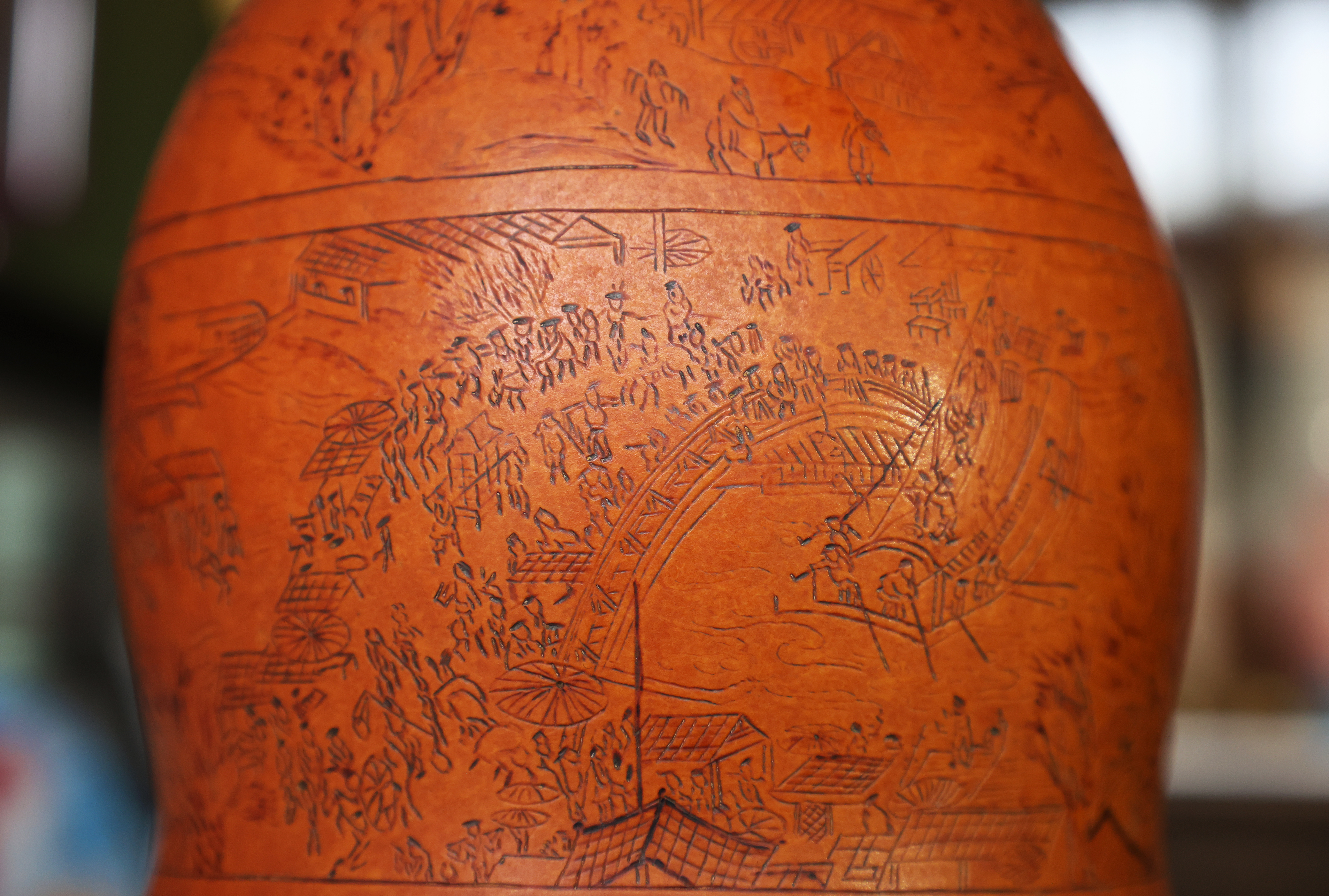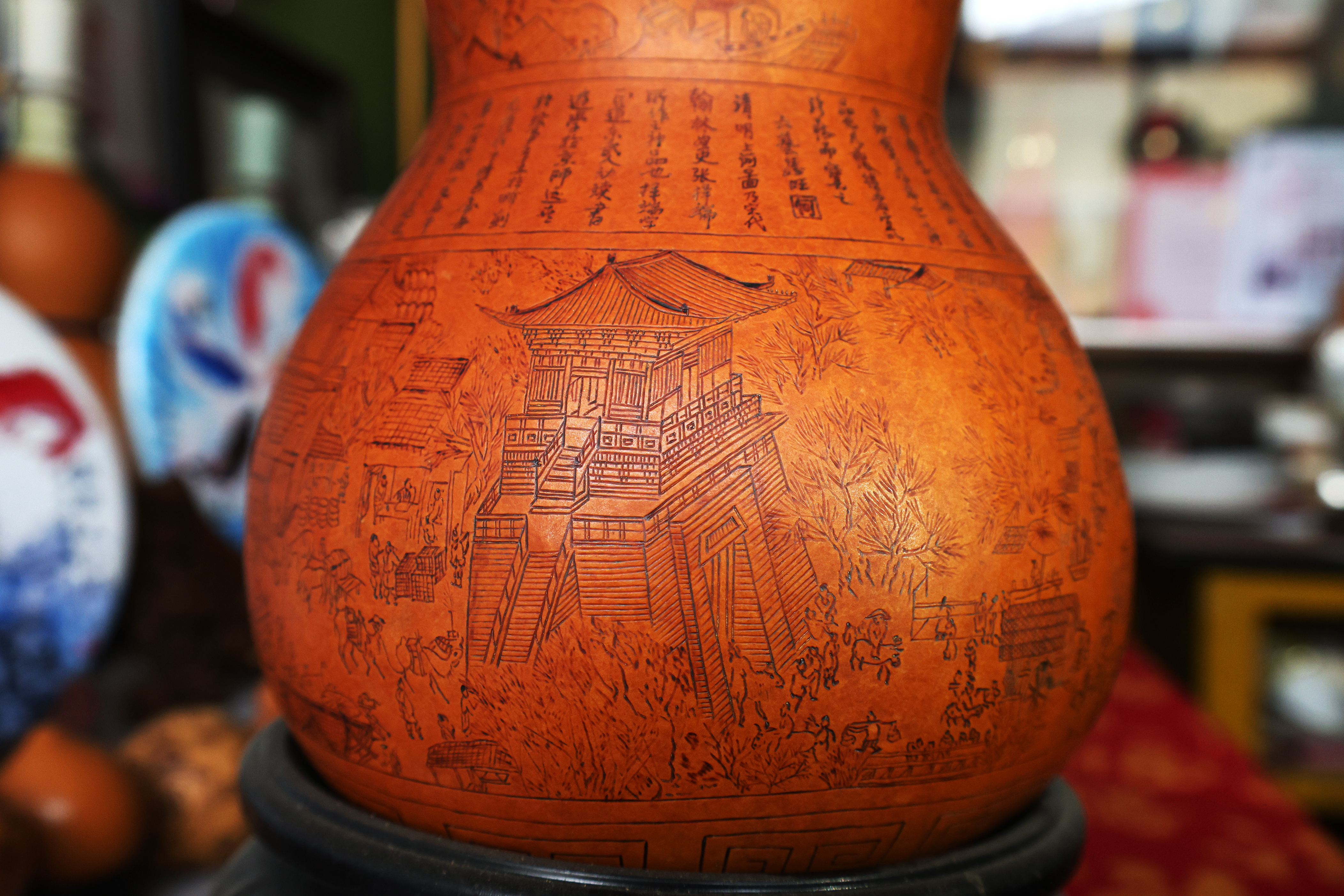 2002年,不甘于“小打小闹”的何胜旺做出了一个大胆决定——将《清明上河图》和《兰亭序》搬到葫芦上。这是一场与自己的较量,更是对传统技艺的致敬。在葫芦的曲面上还原这些鸿篇巨制,难度超乎想象。他反复研究比例、调整布局,尝试不同的烙画技法。三年时间,无数个日夜的打磨,当《清明上河图》葫芦烙画完成时,汴河两岸的市井繁华、虹桥上下的往来船只、酒肆茶坊的喧闹人群,都在方寸之间鲜活起来。2011年,何胜旺的《清明上河图》和《兰亭序》两件作品被收录进《冀州县志》,成为他艺术生涯的高光时刻。