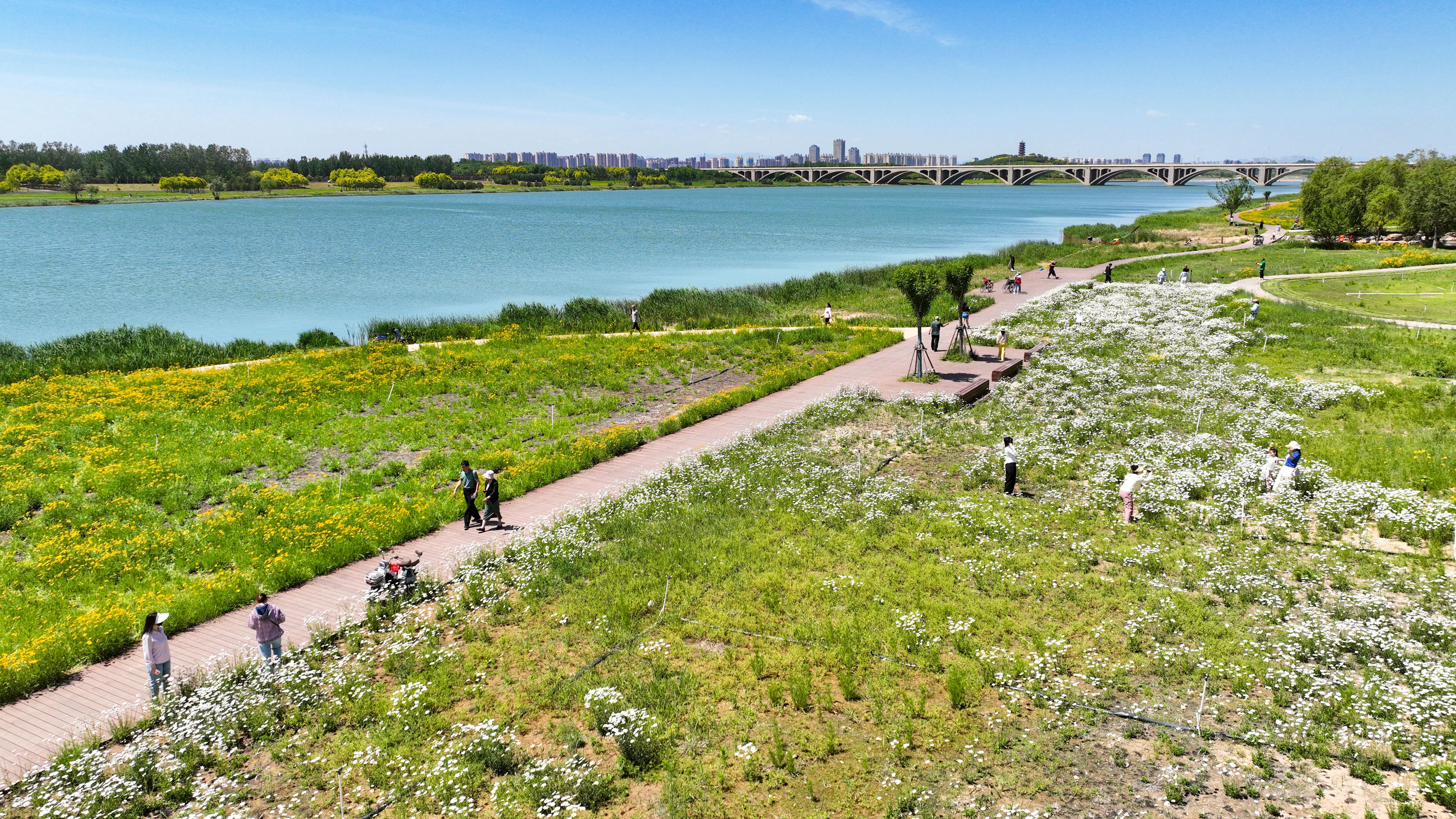 5月的滹沱河生态区(城区段),碧水悠悠,繁花似锦。漫步在体育大街至黄金沙滩的柏坡黄石材步道上,河风轻拂面庞,不远处的观景平台错落分布,游客们或凭栏远眺,或驻足拍照,将大河风光尽收眼底。