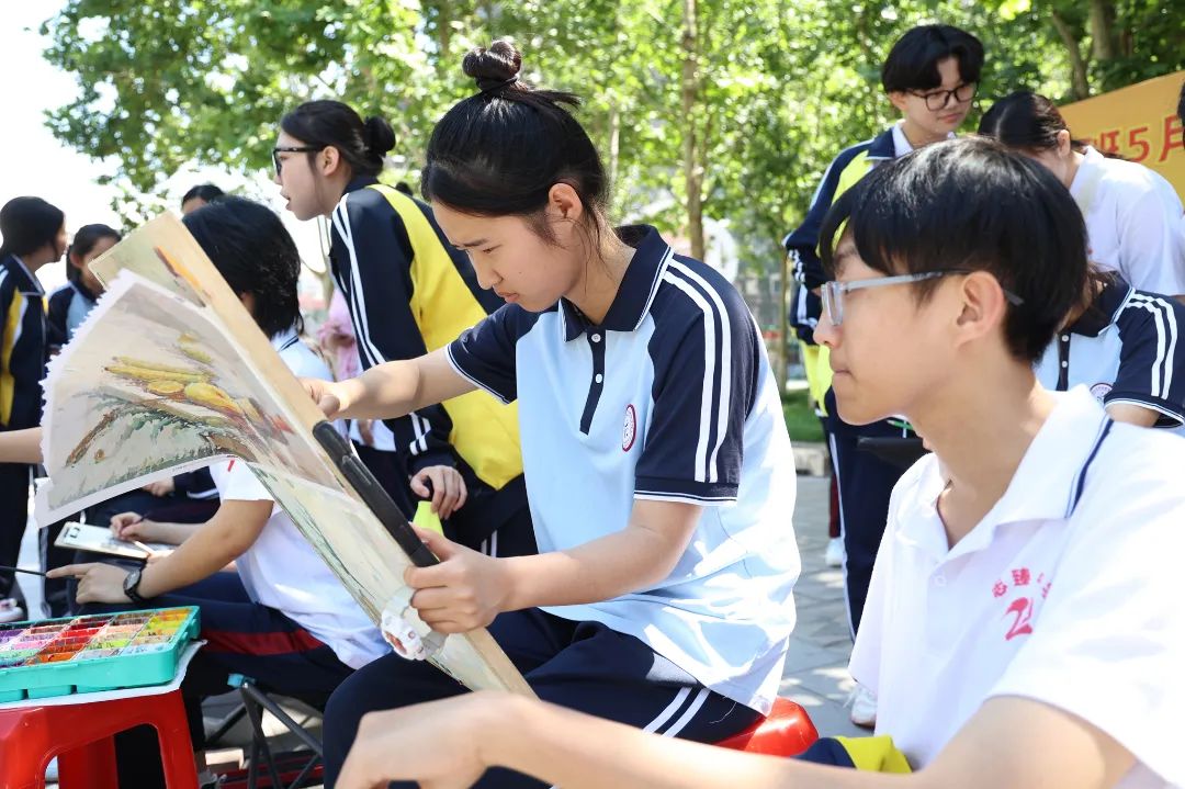 演出结束后,衡水二中美术社成员与特教学校的学生们在名校林前展开了一场别开生面的艺术交流。他们或围坐一圈,分享着各自在绘画创作中的心得与感悟;或携手并肩,共同在画布上挥洒色彩,创作出一幅幅充满想象力与创造力的作品;或手拉手,一起参观校园。最后,衡水二中美术社成员将共同创作的作品赠送给了特教学校的同学们,他们也将自己精心制作的手工作品送给二中学生进行了留念。这一环节不仅增进了两校学生之间的友谊,更激发了学生们对艺术的热爱与追求。