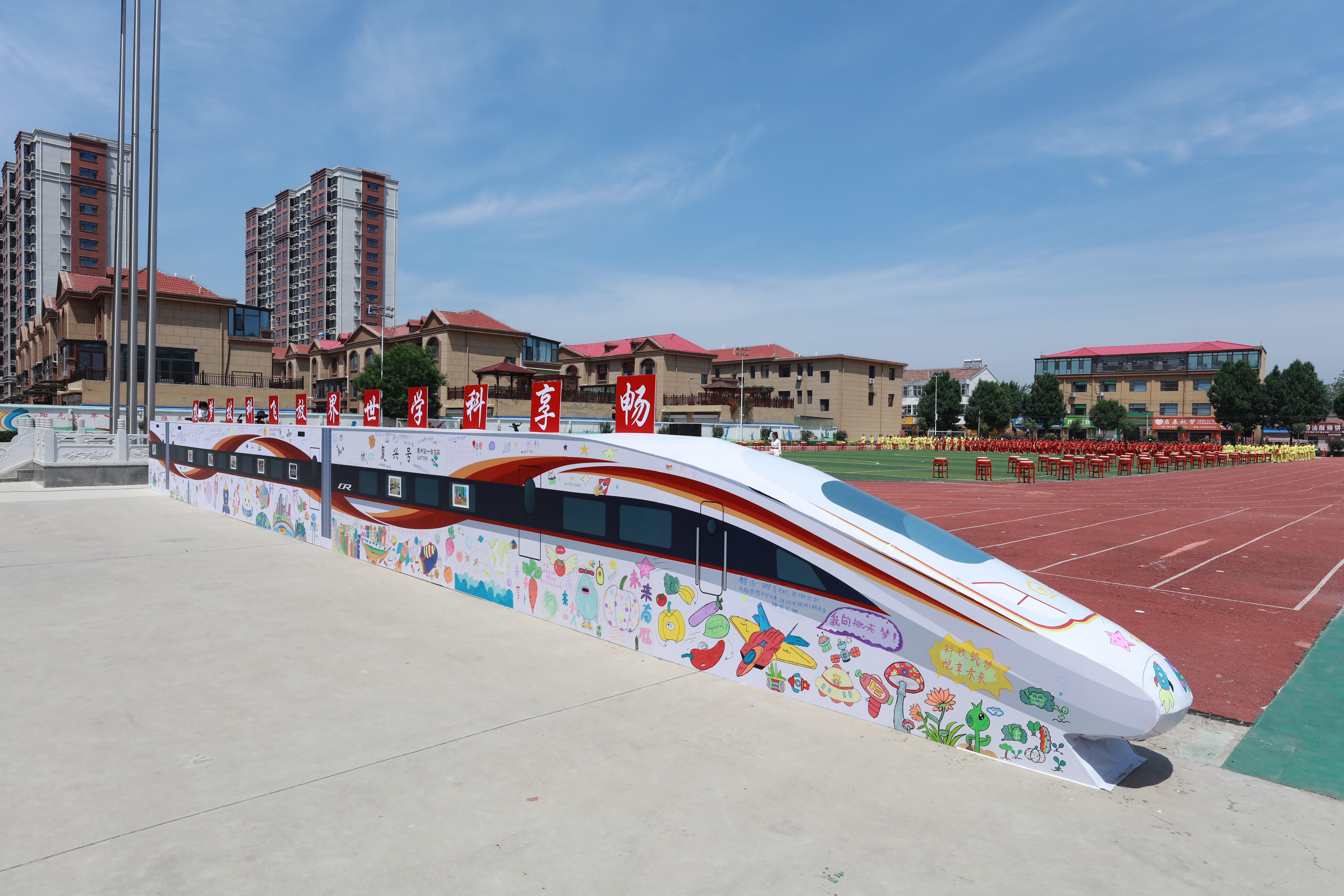 随后,参观者一行来到景县第二小学和第五小学,实地考察两校科学教育成果,深入了解学校在科学课程设置、教学方法创新、学生实践活动开展等方面的宝贵经验。走进景县第二小学,操场上,学生们整齐划一地跳着韵律操,展现出昂扬向上的精神风貌。每层教学楼主题各异的文化墙,实现“让每一面墙都能说话”。科技启智长廊上,各式各样的科学壁挂仪器让孩子们随时体验科学实验的乐趣,感受科技的无穷奥妙。在景县第五小学,一列承载着科技梦想的“复兴号”涂鸦动车模型格外引人注目,这件充满童趣与创意的手工作品,不仅是孩子们想象力的生动展现,更成为激发科学梦想的“孵化器”。孩子们在触摸中感受国家科技发展的脉搏,在涂鸦创作中学会用科技创造美好,在思考探索中体会科技带来的便利。真实的复兴号连接城市,而这个模型正用想象搭建起孩子们通向未来的桥梁。