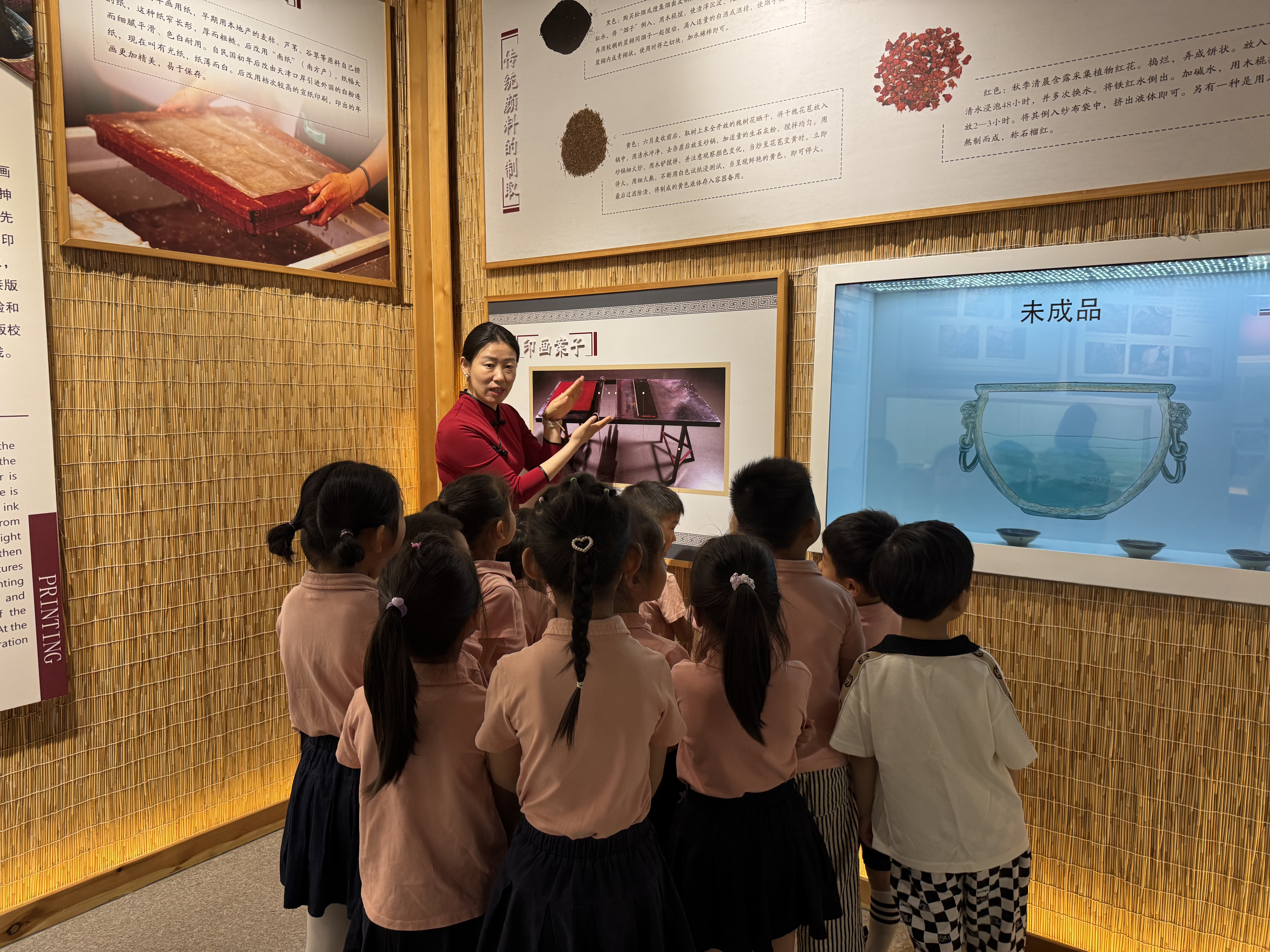 活动以“时空穿越导览”开启,在技艺展示厅,运用魔法墙、AR滑轨、电子印刷等现代科技,结合纱幕投影、透明影箱,生动呈现“老鼠嫁女”“三鱼争月”等武强年画场景,同步讲解寓意,展现古代匠人雕刻技艺,让孩子们领略年画文化内涵。“年画故事剧场”中,神奇的武强年画传说激发孩子们对传统文化的好奇与探索,现场氛围专注而热烈。