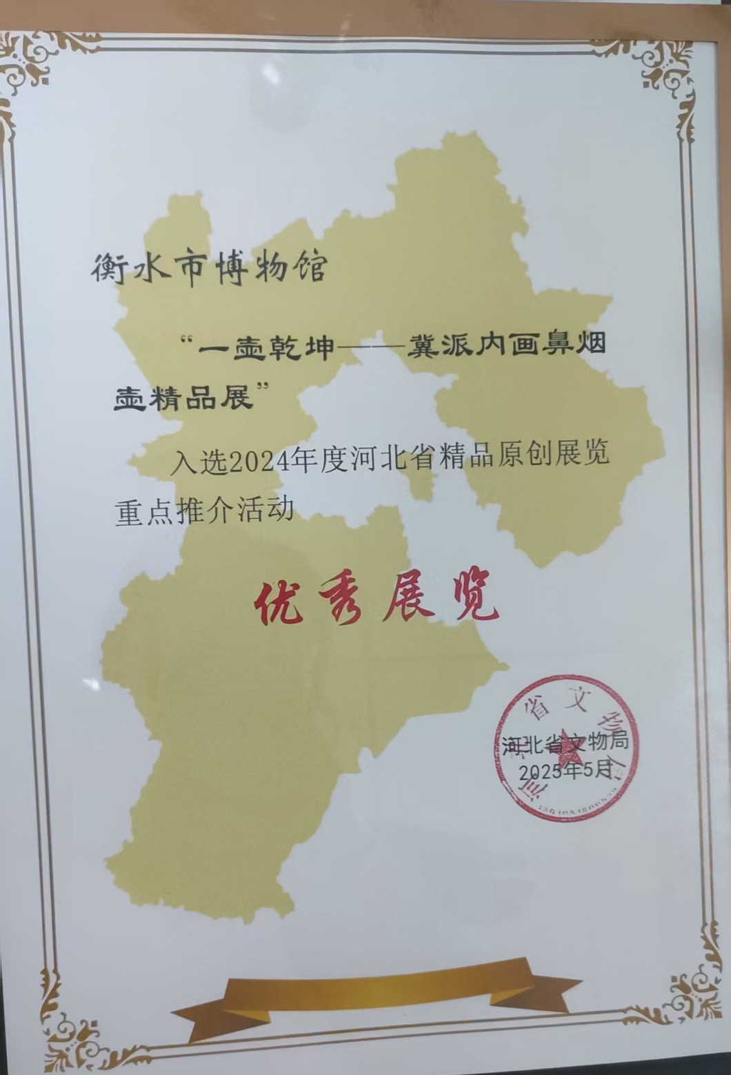 5月16日,2025年“5·18国际博物馆日”河北主会场活动在邯郸市举行。衡水市博物馆原创展览——“一壶乾坤——冀派内画鼻烟壶精品展”在“2024年度河北省博物馆精品原创展览推介活动”中,被评为“2024年度河北省重点推介优秀原创展览”。