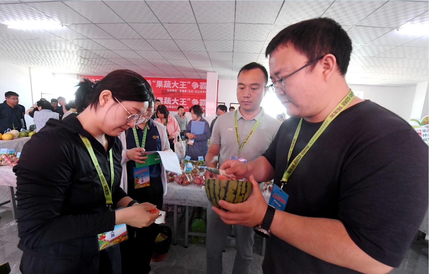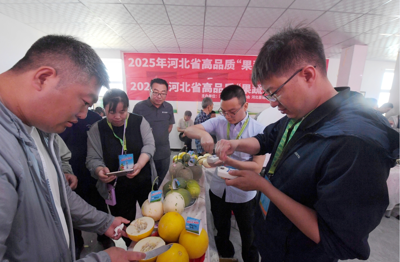当日上午9时许,饶阳县大尹村镇农技科技服务中心内果香扑鼻,色泽诱人的西瓜、圆润饱满的番茄、香气馥郁的甜瓜整齐陈列。由农业领域权威专家、消费者代表组成的专业评委团手持糖度仪、农残检测仪等设备,化身“专业考官”。他们时而俯身用放大镜细察果蔬表皮纹路,时而切开果实轻嗅香气、品尝口感。“每颗参赛果蔬都要过农残快检关,扫码就能追溯从育苗到采摘的全流程。”评委王振庄展示着手中附带生产档案的参赛样品,“这既是品质较量,更是河北‘标准入棚’成果的集中亮相。”