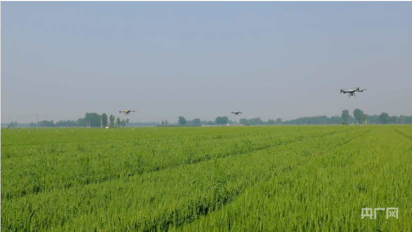 植保无人机群正在广袤麦田上进行作业(央广网记者 王艺霖 摄)