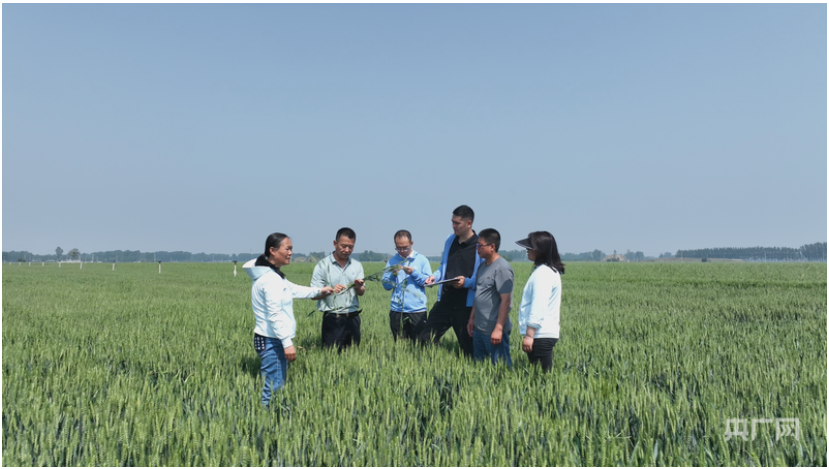 工作人员研判小麦生长情况(央广网记者 王艺霖 摄)