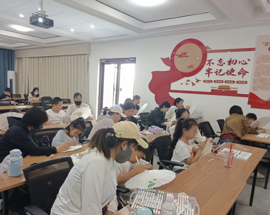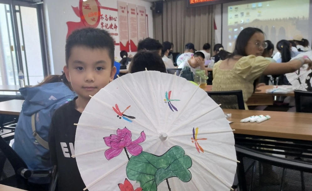 随后,最令人期待的手工DIY油纸伞彩绘环节正式开始。社区工作人员为每个亲子家庭发放了材料包,里面精美的空白古风油纸伞和色彩斑斓的水彩笔,瞬间点燃了大家的创作热情。孩子们迫不及待地拿起画笔,在油纸伞上尽情挥洒自己的创意。有的画出了金灿灿的麦穗;有的描绘夏日里盛开的荷花;还有的将自己和爸爸妈妈的形象画在伞上。经过近一个小时的精心创作,一把把原本空白的油纸伞变得色彩绚丽。孩子们高举着自己的作品,脸上洋溢着自豪与喜悦的笑容,纷纷与家长合影留念,定格这美好的瞬间。
