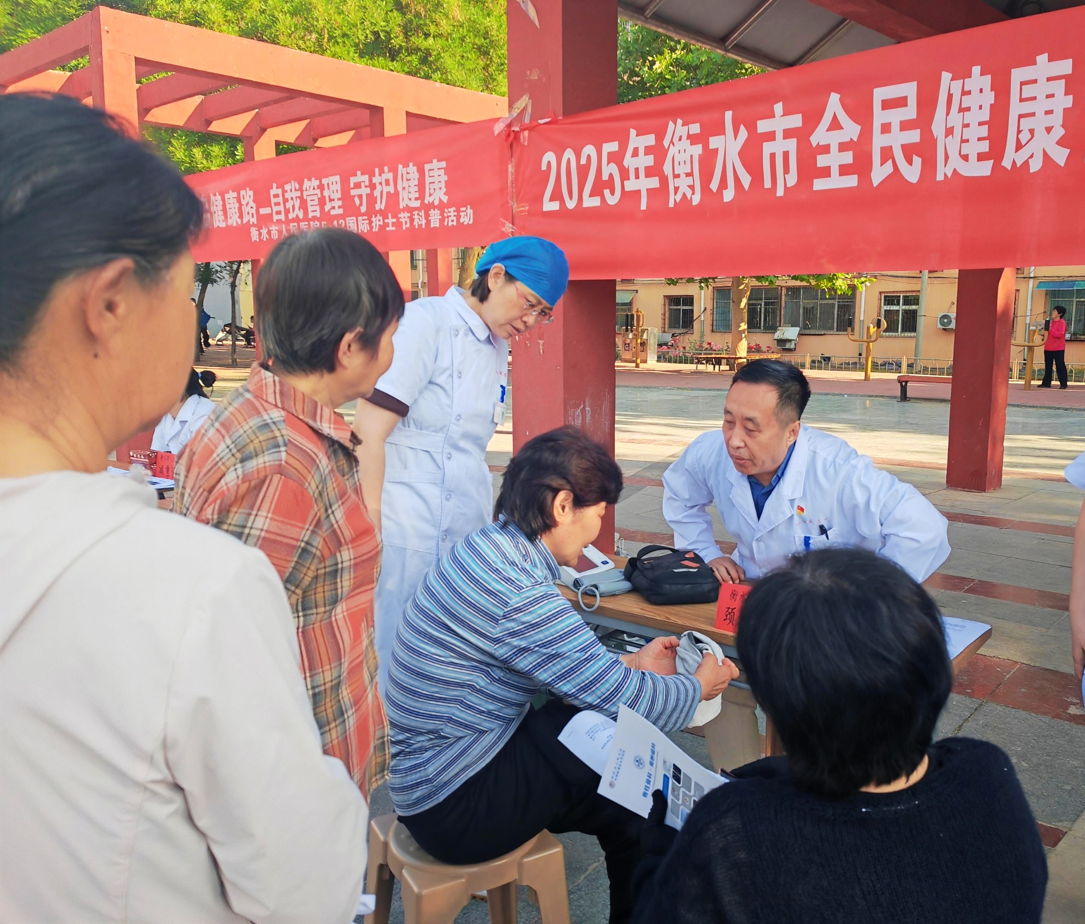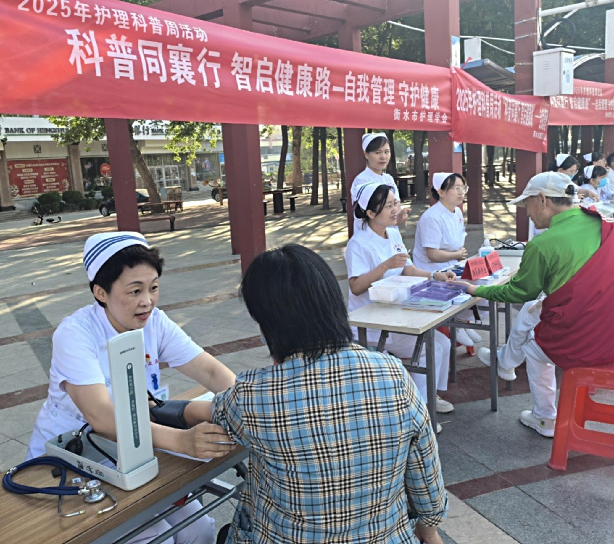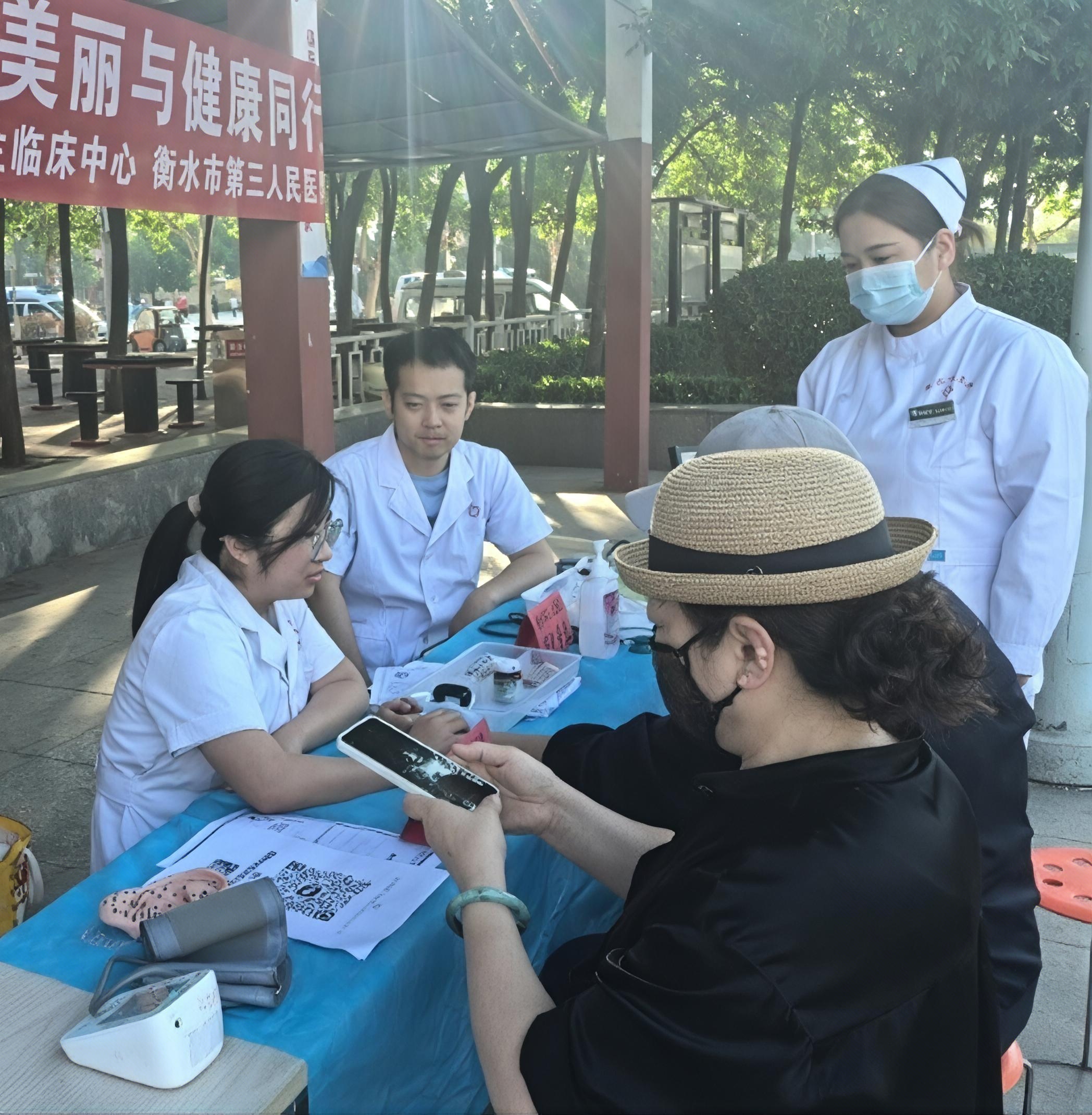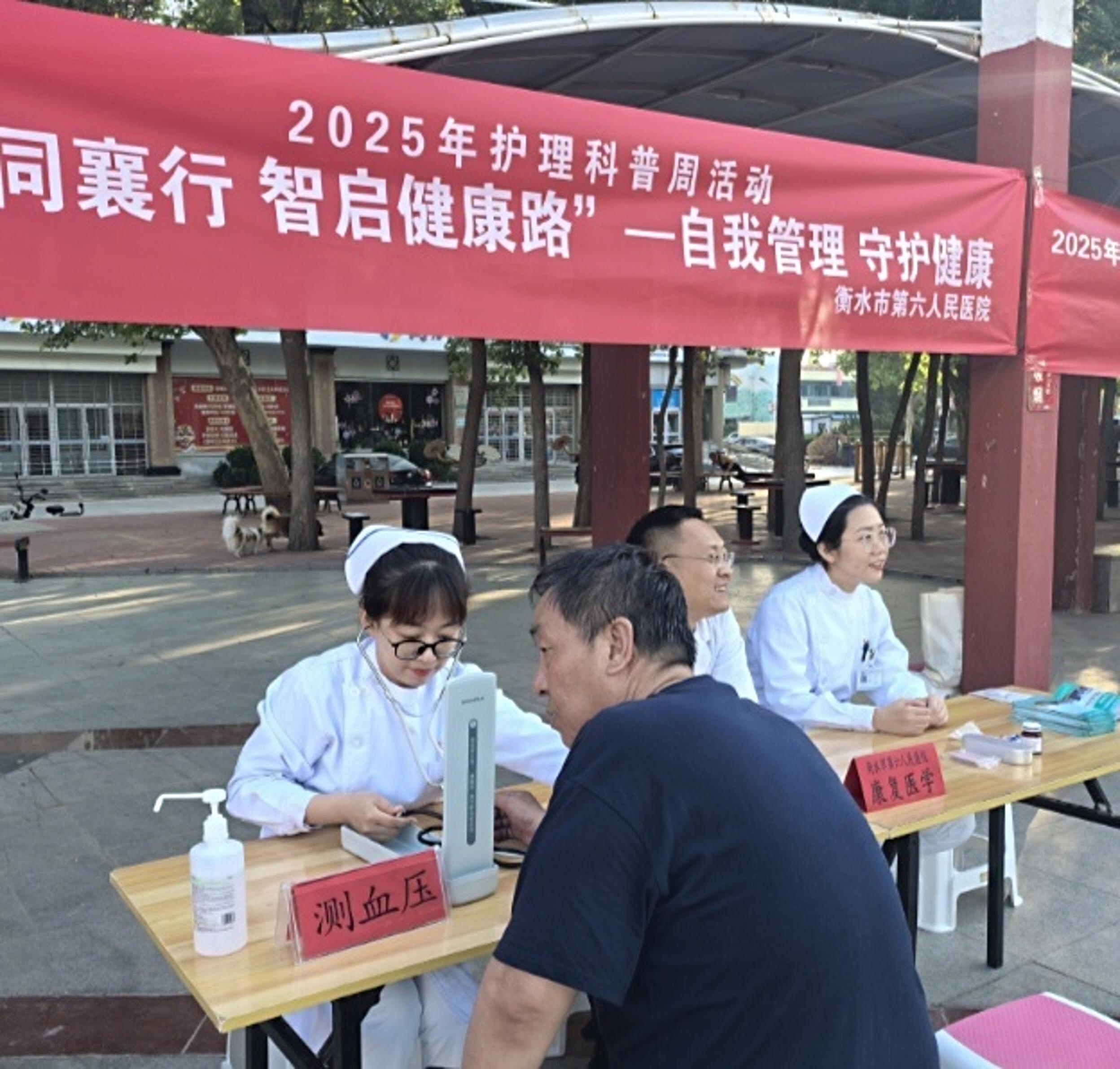 衡水市第六人民医院组织康复专业的资深医护工作者,助力全民健康素养。图为在为群众测量血压。