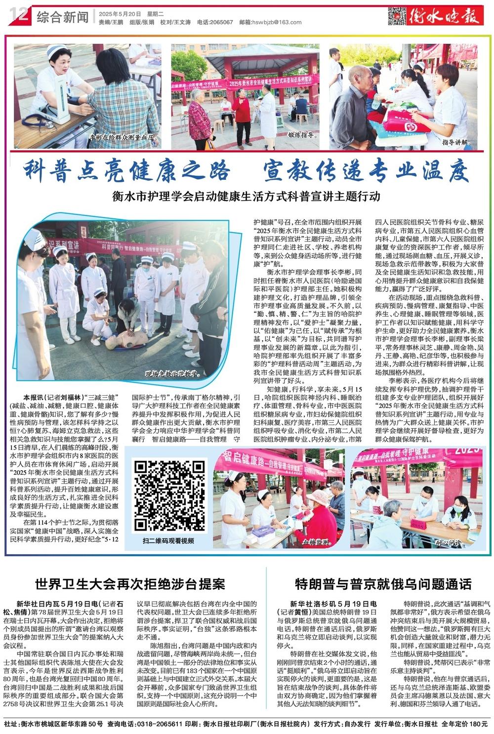 在第114个护士节之际,为贯彻落实国家“健康中国”战略,深入实施全民科学素质提升行动,更好纪念“5·12国际护士节”,传承南丁格尔精神,引导广大护理科技工作者在全民健康素养提升中发挥积极作用,为促进人民群众健康作出更大贡献,衡水市护理学会全力响应中华护理学会“科普同襄行 智启健康路——自我管理 守护健康”号召,在全市范围内组织开展“2025年衡水市全民健康生活方式科普知识系列宣讲”主题行动,动员全市护理同仁走进社区、学校、养老机构等,来到公众健身活动场所等,进行健康“护”航。