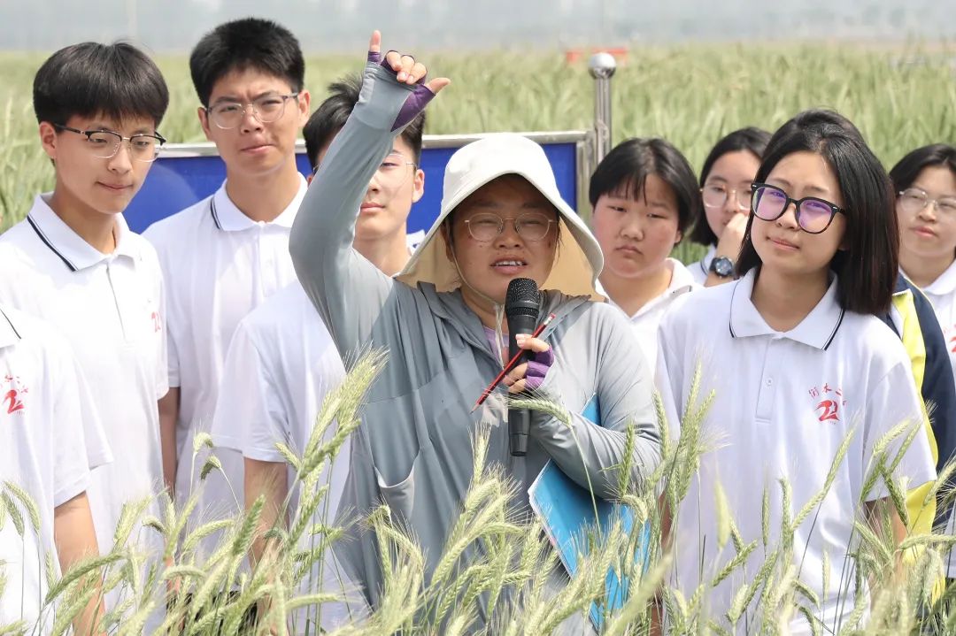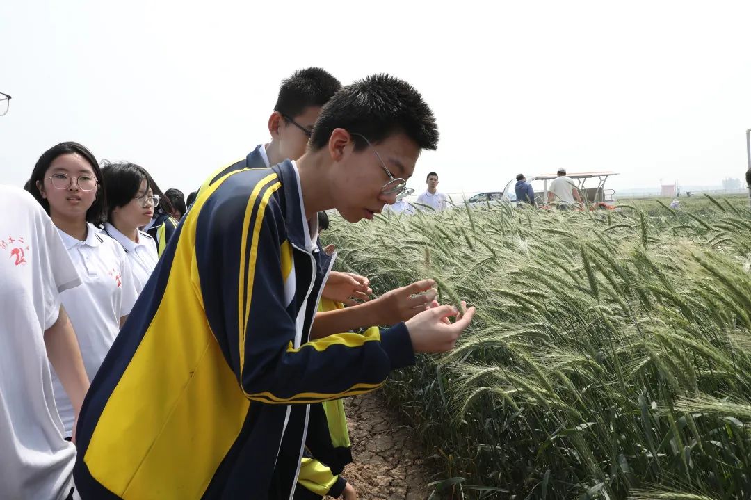 来到小麦品种展示试验田现场,副研究员李丁带领二中师生开启了一场沉浸式科研实践。他系统展示了多个主推及新育成的小麦品种,并细致解析了各品种的抗旱性及耐盐碱能力。讲解过程中,同学们全神贯注,仔细观察穗部结构的差异。