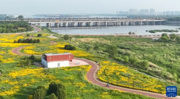 骑行爱好者在石家庄市环城绿道骑行(无人机照片)。