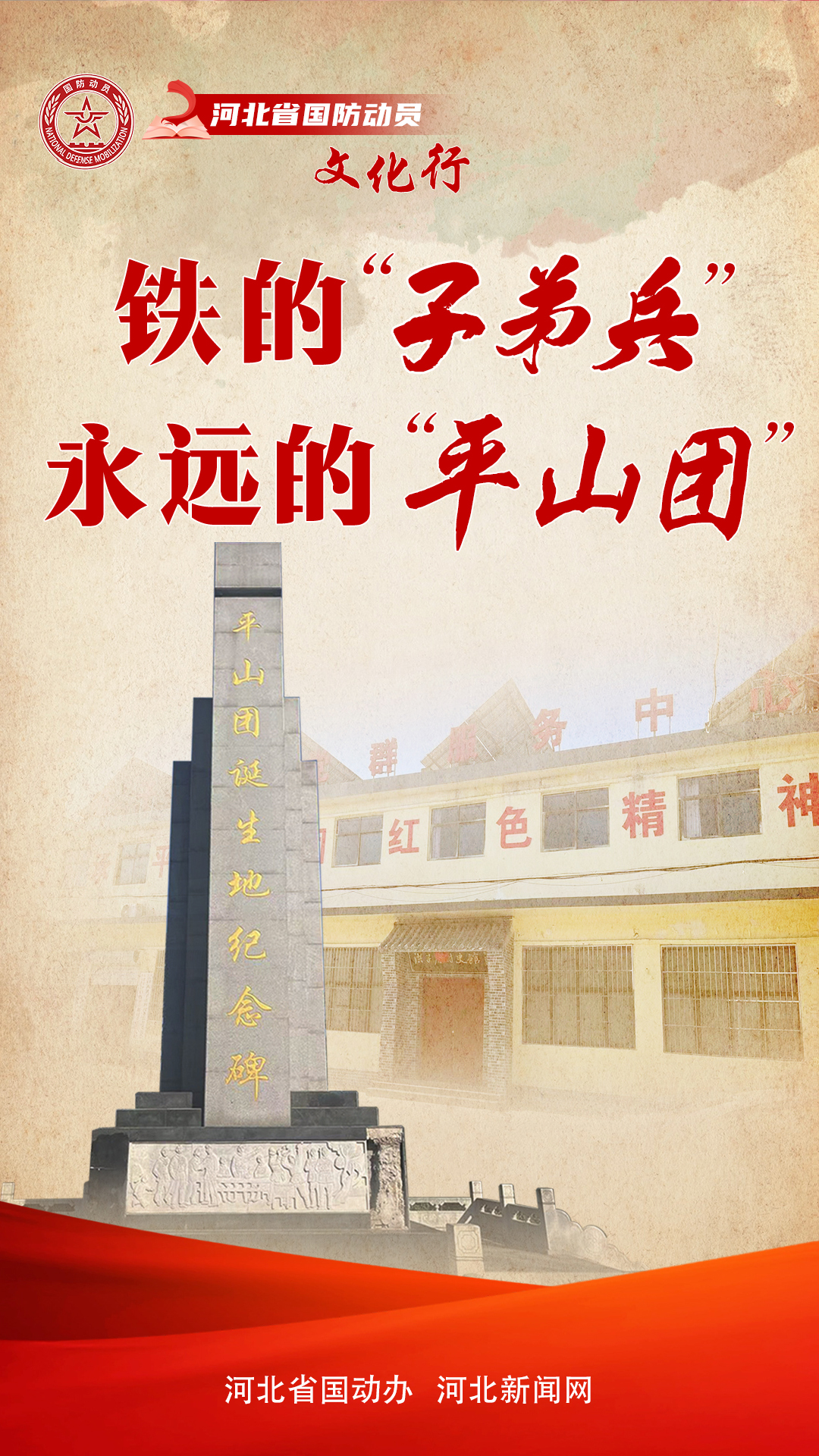 走进河北省平山县西洪子店村,青青松柏间,村广场上“平山团诞生地纪念碑”高高耸立。从小听着“平山团”故事长大的77岁老人王汉旺站在纪念碑前,又一次讲起“平山团”的故事。在抗战时期,平山县动员男女老少齐参军,武装力量动员最终形成的磅礴伟力,成为了这段故事最动人的篇章,也成为了如今国防动员宣传教育最生动的素材。