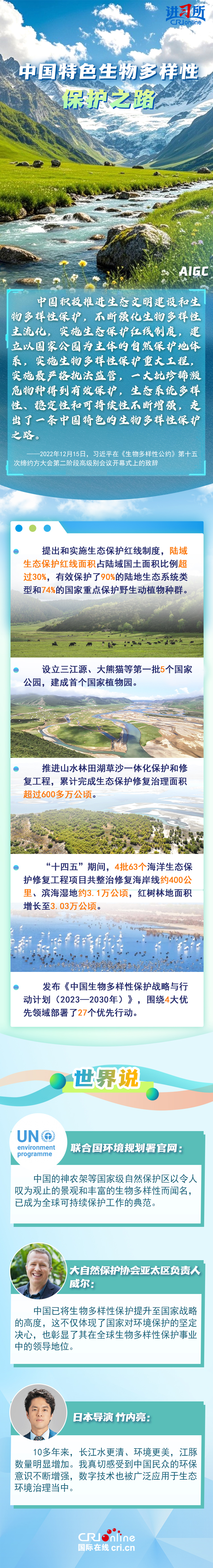 “心往一处想、劲往一处使,共建地球生命共同体。”作为最早签署、批准《生物多样性公约》的缔约方之一,生物多样性保护已经上升为中国的国家发展战略。国际人士表示,中国的一系列举措体现出对生态环境保护的坚定决心,同时,中国依托共建“一带一路”倡议等国际合作机制,为推动全球生物多样性保护提供了有力支持,在迈向自然友好型未来的过程中发挥关键的引领作用。